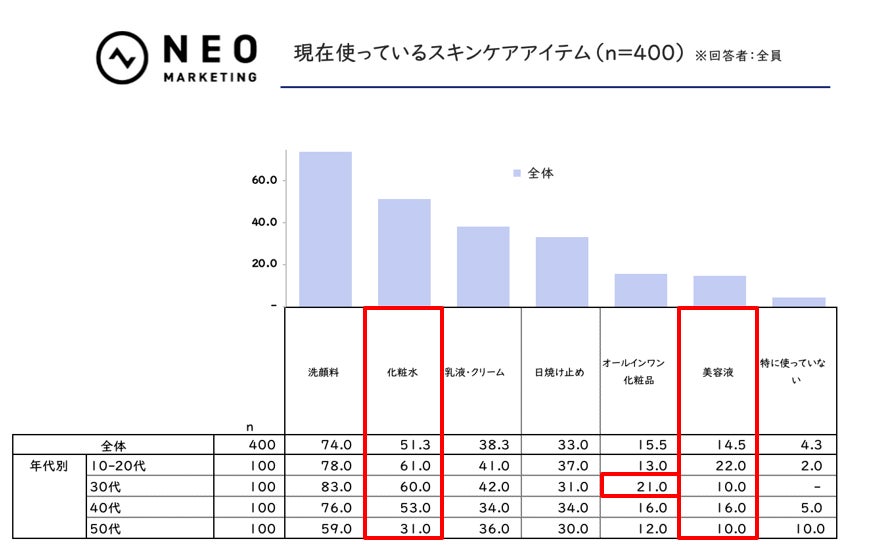 保湿系では「化粧水」が全体51.3%ながら、10–20代・30 代が60%超、50代は31.0%と半減し、年代ギャップが最も顕著でした。