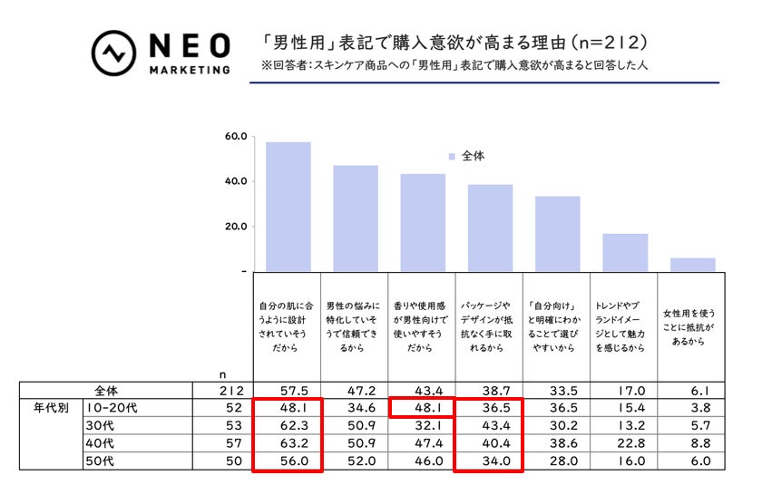 一方、10–20代は「香りや使用感が男性向け」(48.1%)の比率が最も高く、デイリー使いする上での“快適な使用体験”を求める姿勢が際立ちました。30代以上では機能訴求がさらに重視され、特に30代は「自分の肌に合うように設計されていそうだから」への支持が60%超と最多。スキンケア選びに迷う30代層にとって、男性専用設計や成分のわかりやすい説明が後押しになると考えられます。