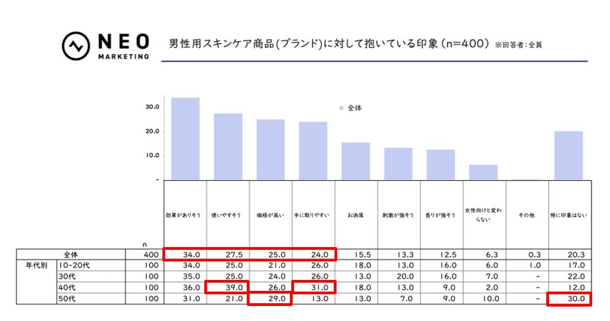 男性用スキンケアブランドへの印象は、「効果がありそう」が34.0%でトップ、「使いやすそう」(27.5%)と「価格が高い」(25.0%)が僅差で続きました。ポジティブ評価が先行する一方、価格面のネガも上位に入り、“値段以上の価値を期待しつつも高いと感じる”二面性が透けて見えます。