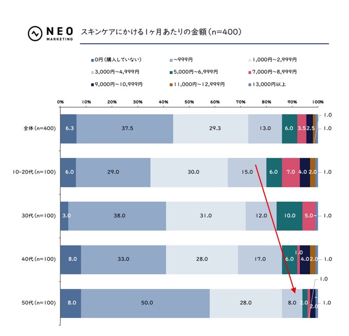 スキンケアにかける1ヶ月あたりの金額をお聞きしました。