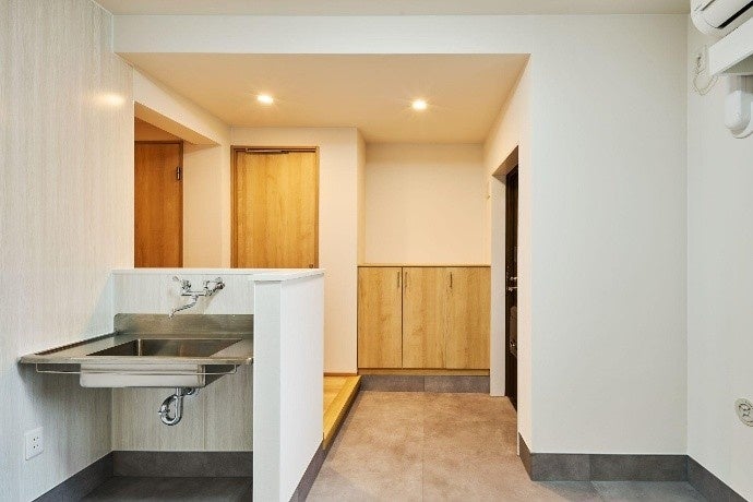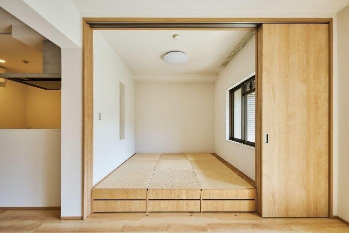 専有部は、子育てを快適にする広々とした玄関土間や、くつろぎと遊び場を兼ね備えた小上がりスペースなど、子育て世帯に優しいプランニングを行っています。アップサイクル建材を天井や壁に使用し、リノベーション工事で出た畳やカーテンの廃材をアップサイクルしたおもちゃをキッズコーナーに用意。SDGsを身近に感じられる仕掛けを作りました。