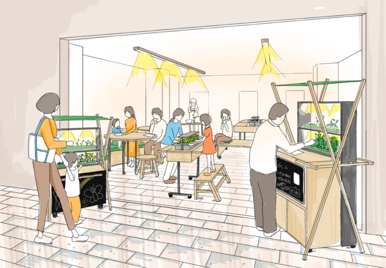 本研究を行う場所として、コミュニティ拠点「GardEN(ガーデン)」を作りました。「GardEN」は、庭を意味する「Garden」と「縁」の造語で、千葉大学の学生が人と人の「縁」が育つ場所になってほしいという願いをこめて名付けました。住民や地域の方が世代や国籍を超えて自然と集い、植物を「みる・そだてる・たべる」体験ができる可変型スペースです。未活用だった集会室を、キッズスペースやワークコーナーのあるシェアスペースに改装した本空間は、イベント時と通常時で柔軟にレイアウトを変更でき、キッズルームにおける安全・衛生面への配慮も徹底します。