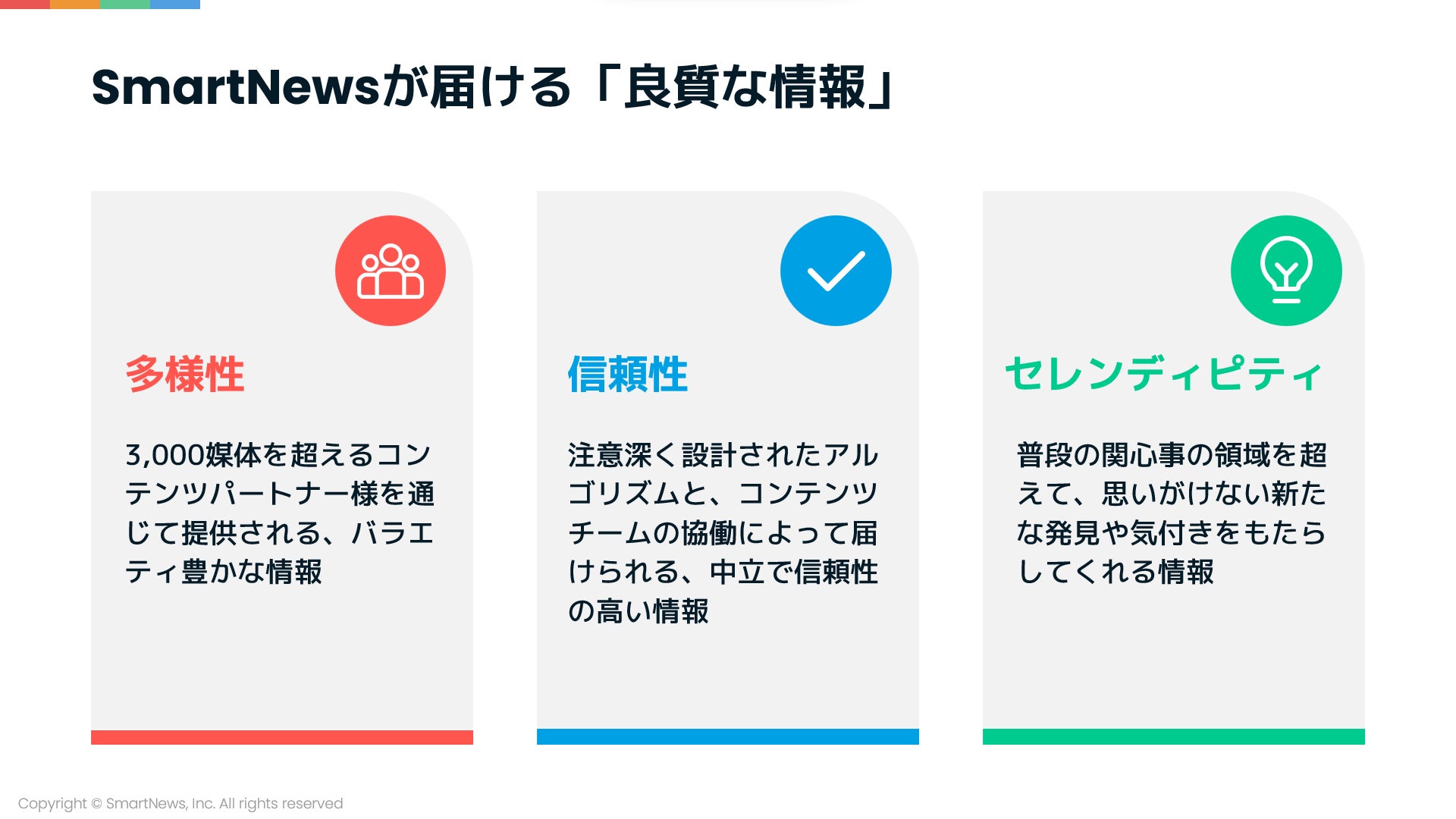 3,000以上のメディアパートナーから提供されるバラエティに富んだ情報の「多様性」、中立性を保ちながらアルゴリズムにより最適化されたニュースを届ける「信頼性」、普段の関心事の範囲を超えた思いも寄らない新たな発見・気づきをもたらす「セレンディピティ」の3つを軸に、事業を拡大してきました。
