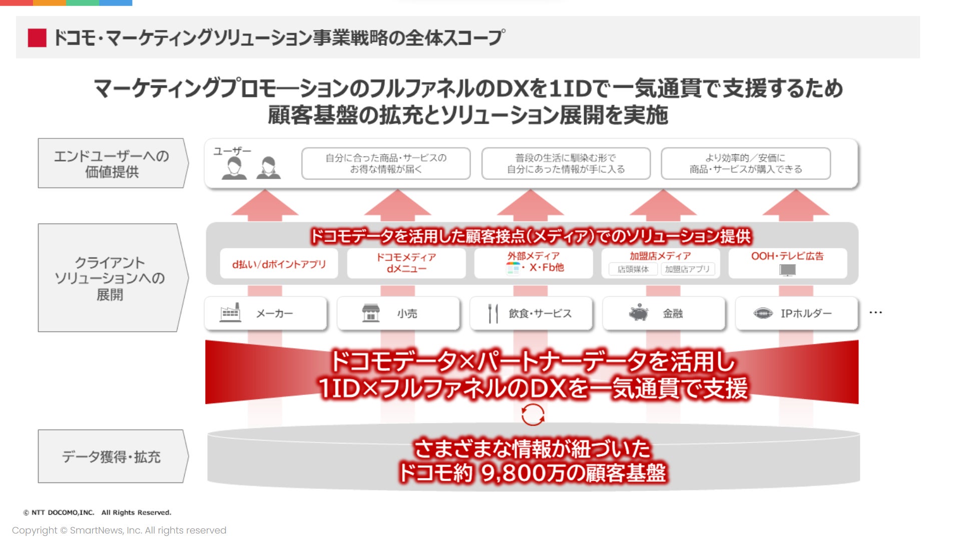 次いで、日本最大のニュースアプリであるSmartNewsと、約9800万の顧客基盤を抱えるドコモの業務提携で生まれる全体像や、データの相互利用における可能性について説明しました。