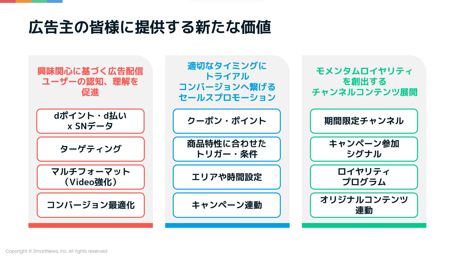 今まではドコモのd払いやdポイントに合わせ、パフォーマンス型の広告を出稿する企業が多かったなか、SmartNewsの構築する多様な「出面」があれば、認知から購買までのフルファネルでのマーケティング施策が可能になり、「ブランド型広告にニーズがある企業にドコモのアセット活用を促していける」と石橋氏は述べました。