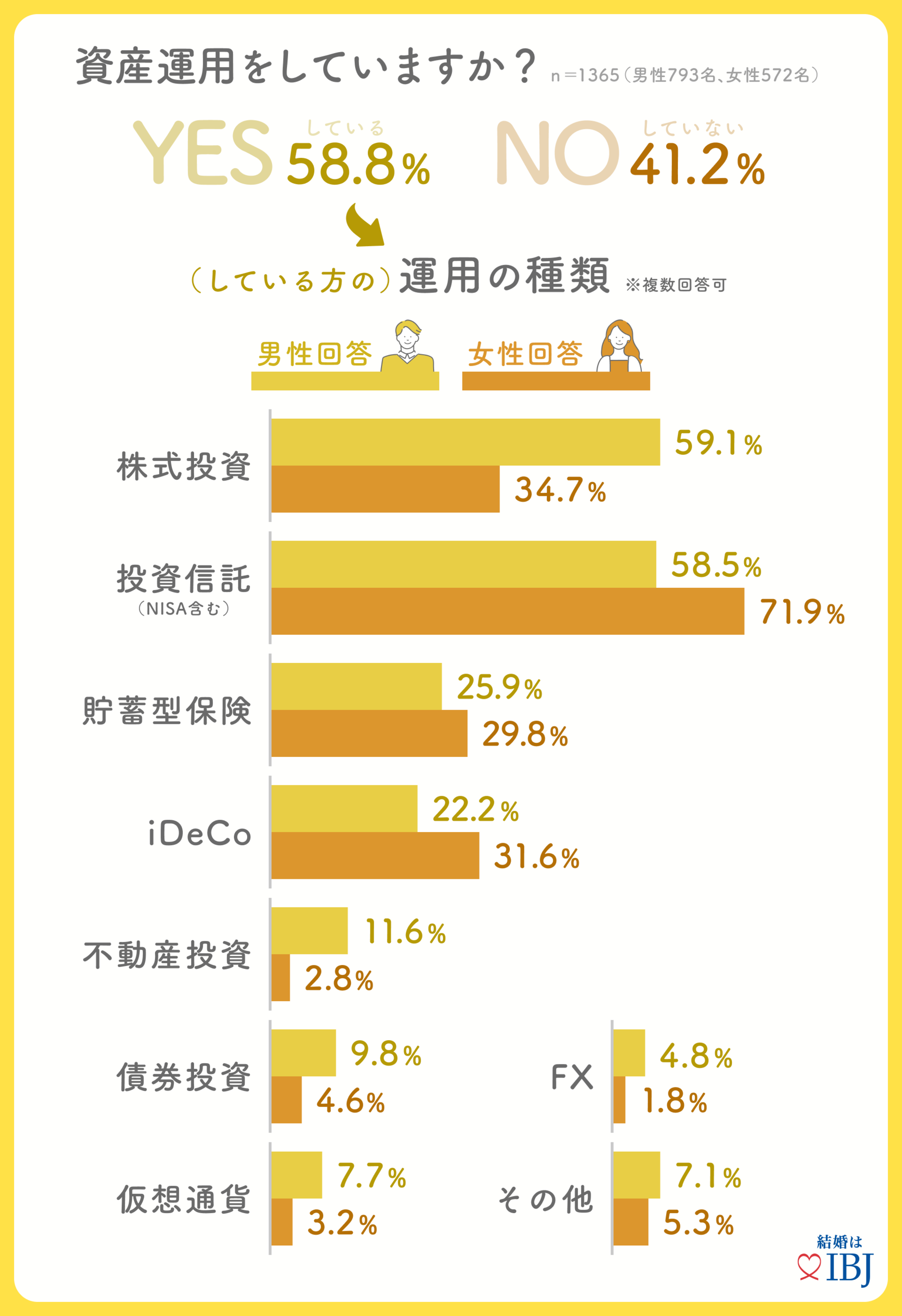 資産運用の種類として、女性7割、男性6割が「NISA」等の投資信託を行っている結果に!婚活者のリアルな貯蓄と資産事情を公開。