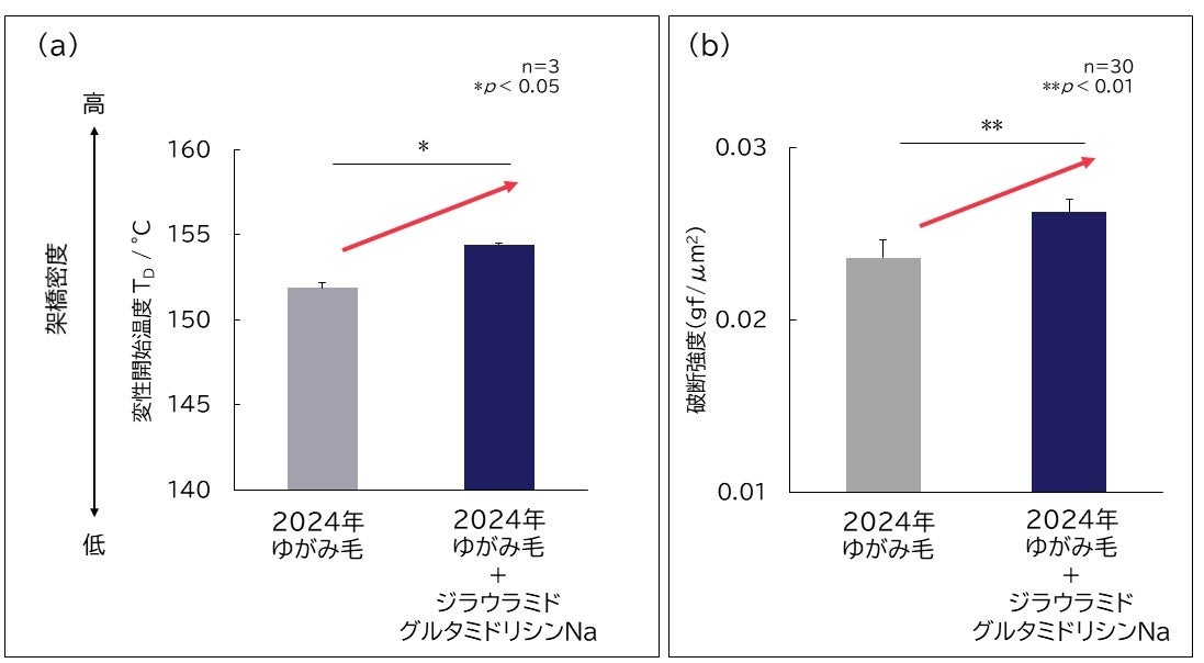 そこで、「毛髪内部の架橋密度を上げる」成分についてさまざまな成分を探索した結果、「ジラウラミドグルタミドリシンNa」に効果を見出しました。ジラウラミドグルタミドリシンNa」で年齢を重ねたゆがみ毛を処理し、高圧示差走査熱量測定を行い毛髪タンパク質の変性温度を算出したところ、その変性温度が有意に高くなることを確認しました(図4a)。この結果は、毛髪内部の架橋密度が上昇したことによるものと考えられます。次に、毛髪へのケア効果を調べるために、毛髪の破断強度を計測した結果、「ジラウラミドグルタミドリシンNa」には、年齢を重ねたゆがみ毛における破断強度を有意に向上させ、体幹を向上させる効果があることを見出しました(図4b)。この体幹向上効果は「ジラウラミドグルタミドリシンNa」の構造中にタンパク質と相互作用しやすいカルボン酸やアミド結合を複数有するため毛髪タンパク質と疑似的な架橋を形成したためであると考えられます(図4c)。