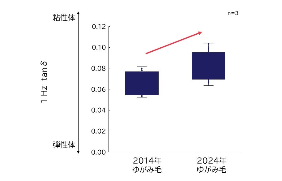 2014年当時に採取した35~44歳の女性5名の直毛とゆがみ毛、さらに左記5名の2024年に採取した直毛とゆがみ毛について一定の荷重と周波数の条件で動的粘弾性測定を実施し、弾性および粘性の性質の指標となるtanδを求めました。なお、tanδとは粘性の寄与を、弾性の寄与で割ったものであり、繊維材料の劣化評価などに使用されています。測定の結果、2014年採取のゆがみ毛よりも2024年に採取したゆがみ毛の方がtanδの値が上昇し、加齢による弾性率の低下が示唆されました(図1)。この物理特性の変化は、髪の体幹が弱くなっていることを反映しており、この変化によって、ゆがみ毛保有者は“気まぐれ髪”を実感しているものと考えられます。