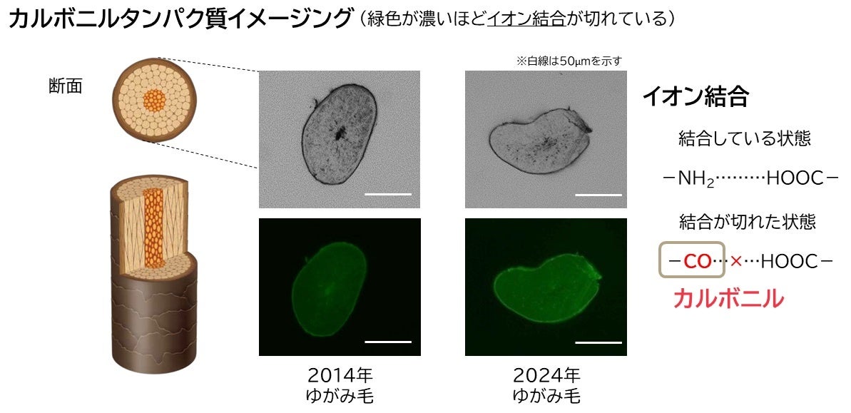 年齢を重ねたゆがみ毛の体幹が弱くなったのは、毛髪の構成成分において約80%を占めるタンパク質が一因であると考え、その中でも、髪を形づくる化学結合に着目しました。髪の化学結合は、例えば水素結合が知られており、この結合は水分によって結合が切れて髪の形状が変化してしまうことが知られています。本研究では、水素結合よりも強度が高い、イオン結合とジスルフィド結合に着目しました。イオン結合が切れていることを反映する、カルボニル化(CO)タンパク質をイメージングした結果、加齢によりゆがみ毛のカルボニルタンパク質が増加していることが確認できました(図2)。
