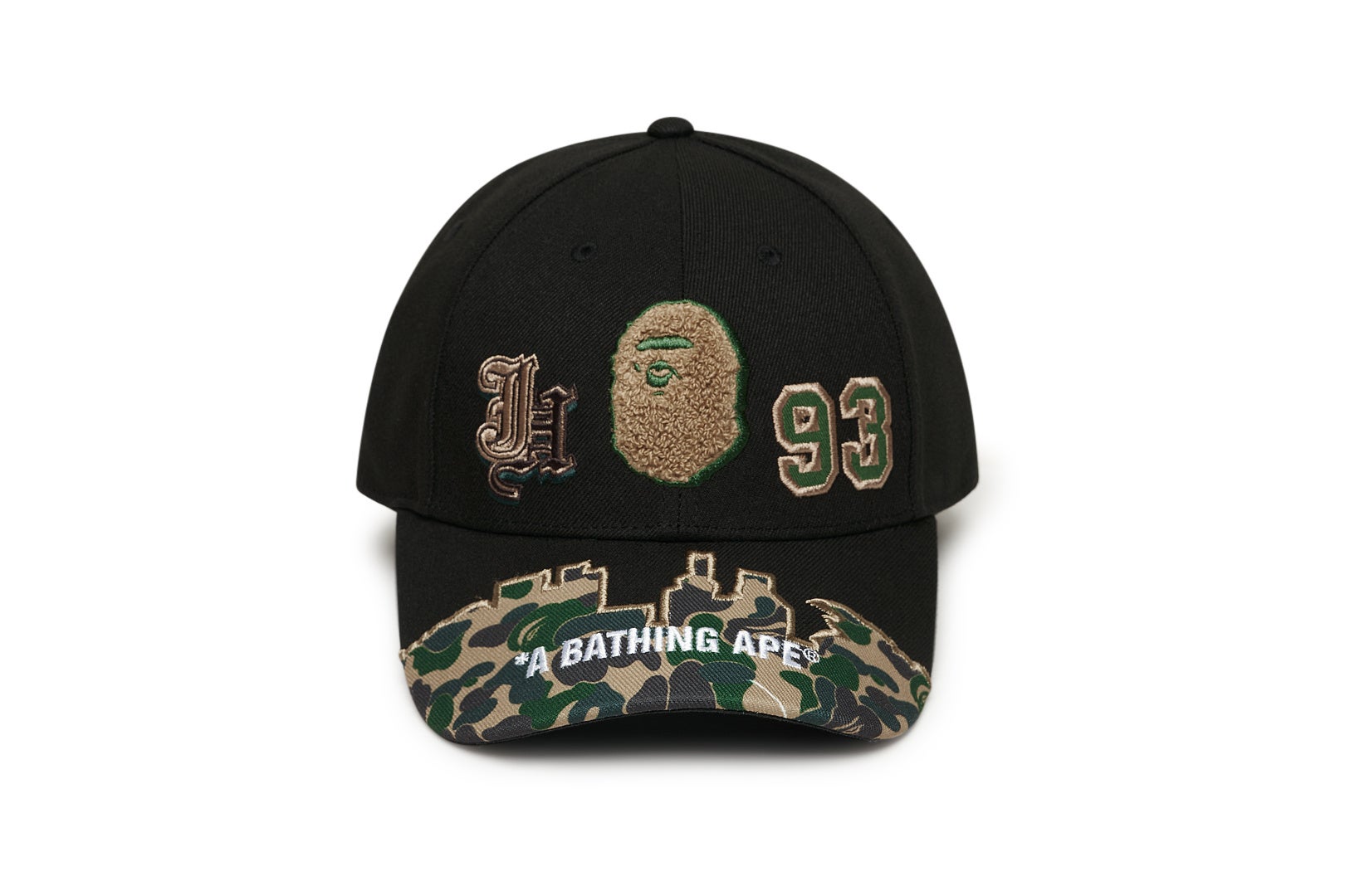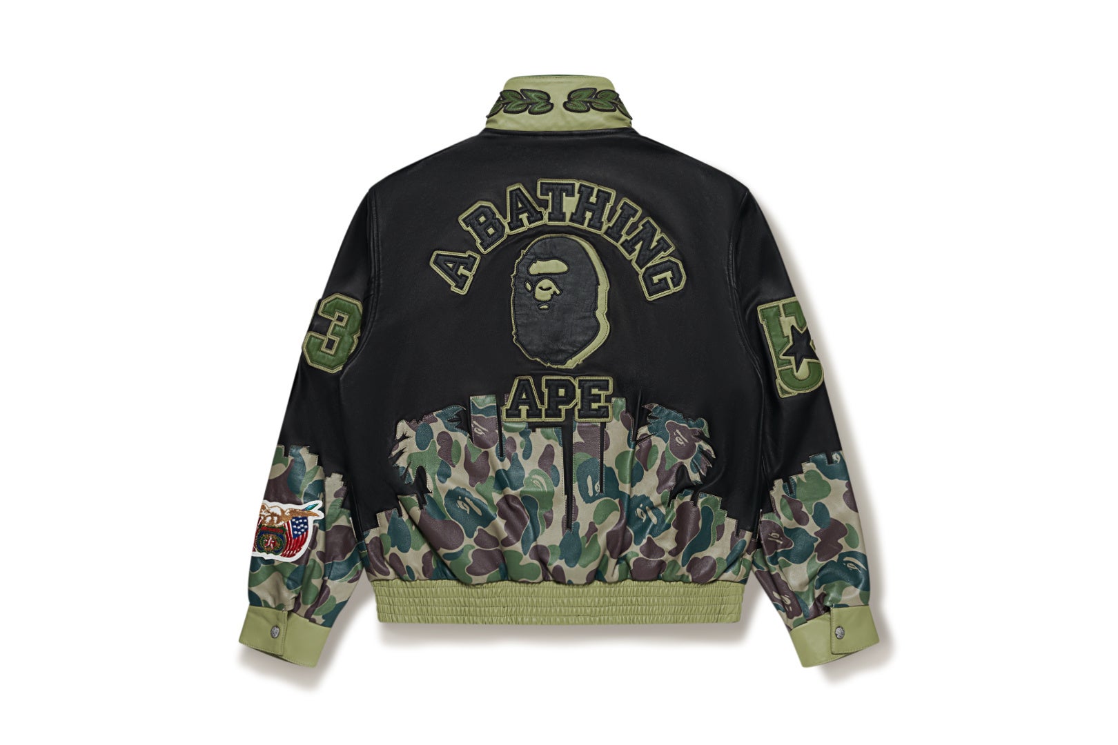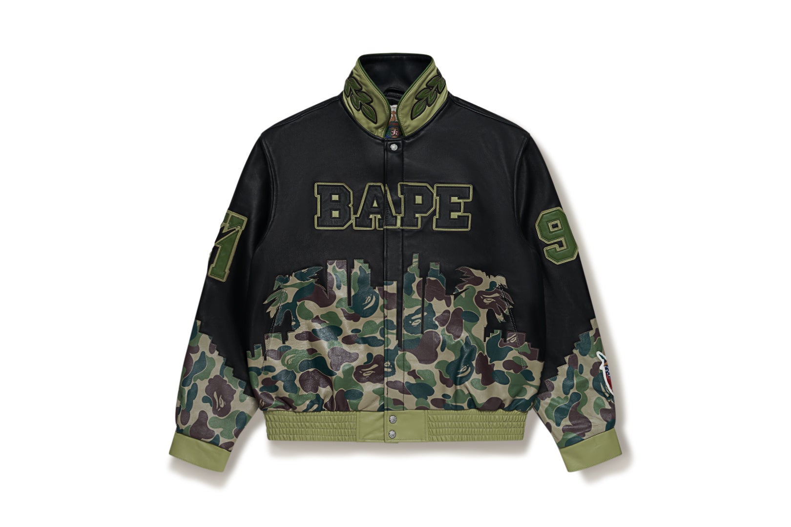 バーシティジャケットは、ウールとABC CAMOパターンレザーを組み合わせ、クラシックなバーシティスタイルをモダンにアレンジ。BAPE®︎がスタートした1993年の「93」の数字やJeff Hamiltonのシグネチャーロゴなどを、フロント、袖、背中に配しました。