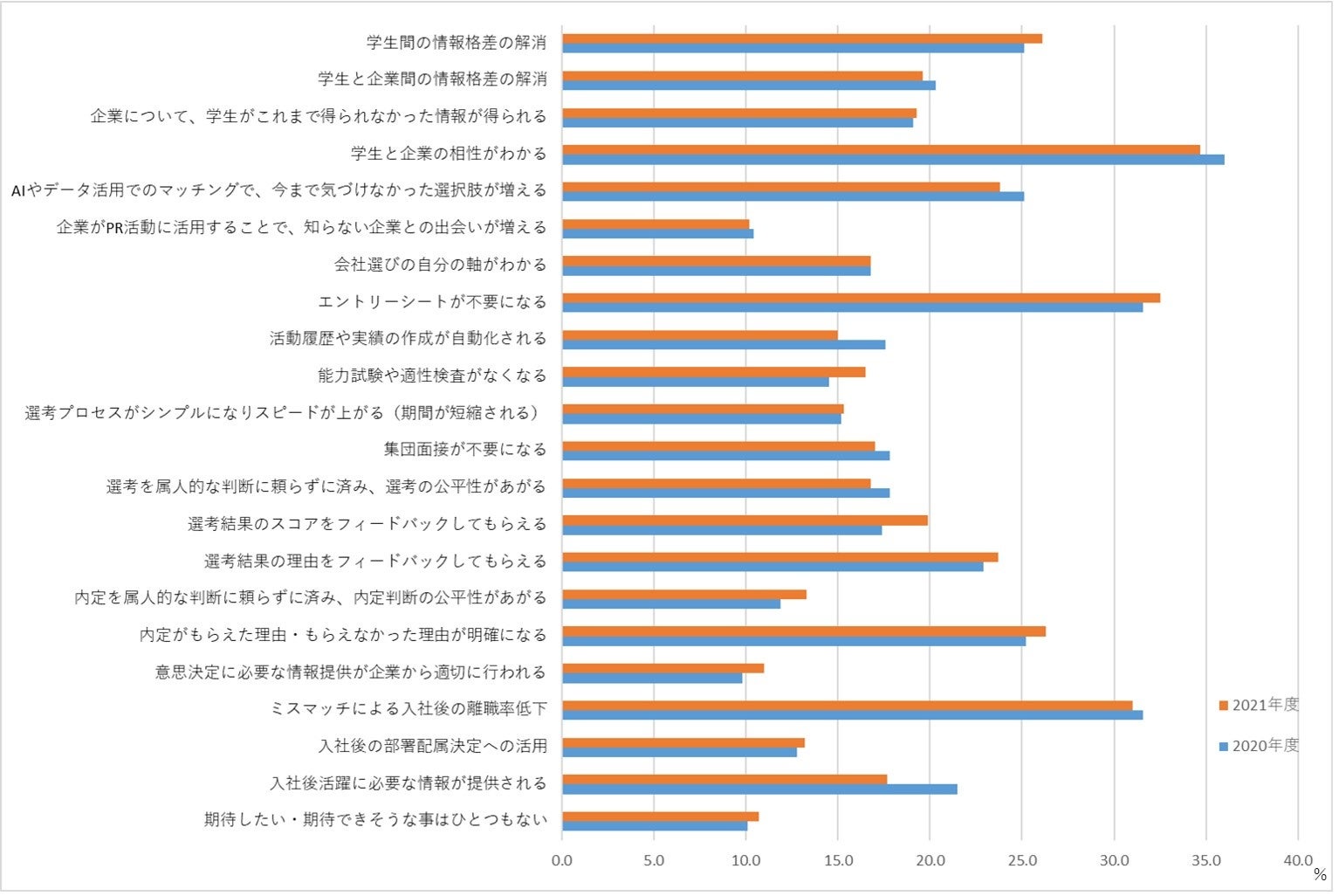 ・選考前の「手間の改善(エントリーシートが不要になる)」、選考過程の「企業とのマッチング向上(相性が分かる、ミスマッチが減る)」、選考後の「選考結果のフィードバック」、入社後の「ミスマッチによる離職率低下」が上位となりました。