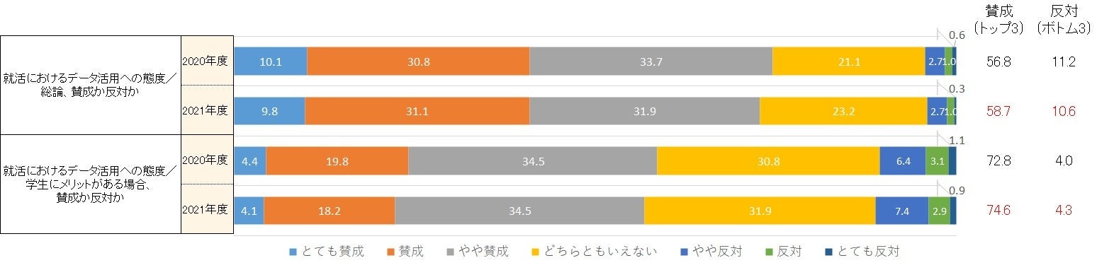 ・学生にメリットがある場合は、賛成(トップ3ボックス)は2020年度の72.8%から2021年度は74.6%へ増加、反対(ボトム3ボックス)も2020年度の4.0%から4.3%に増加しました。