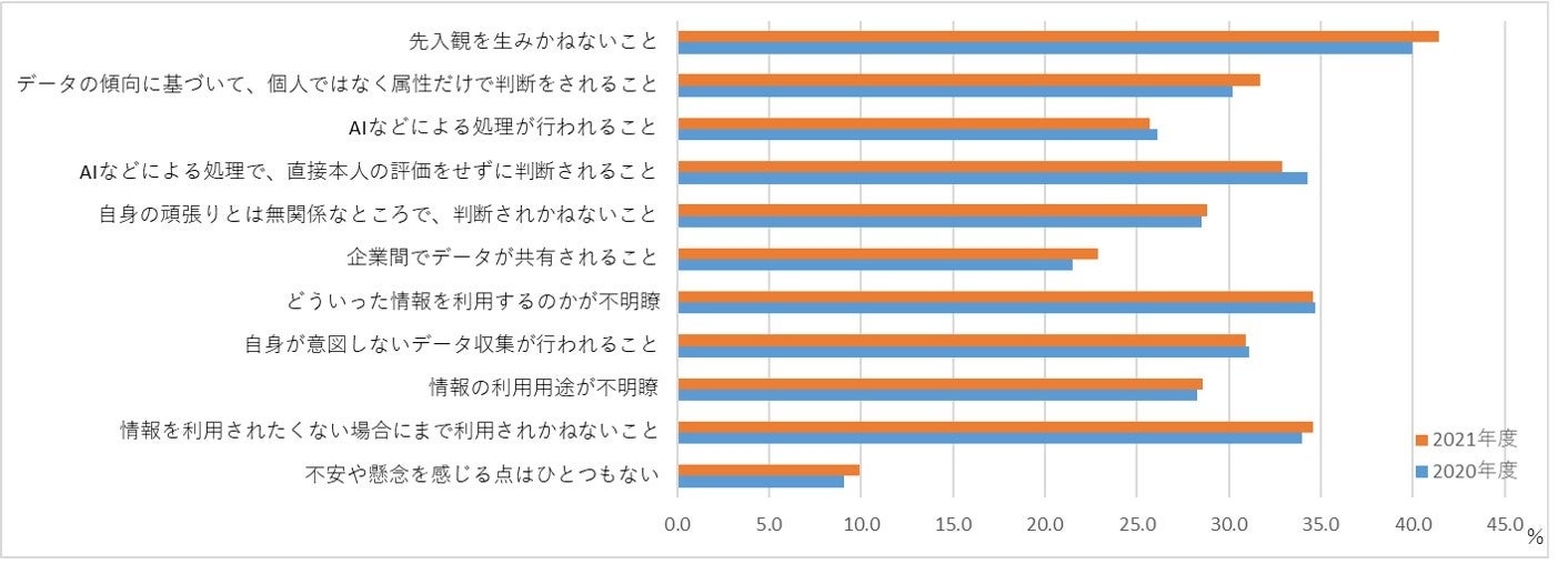 ・本人を見ずに評価するのではないか(先入観、直接本人の評価をしない)や、情報利用の透明性(どの情報、利用されたくない場合にも利用)に対する懸念が上位となりました。