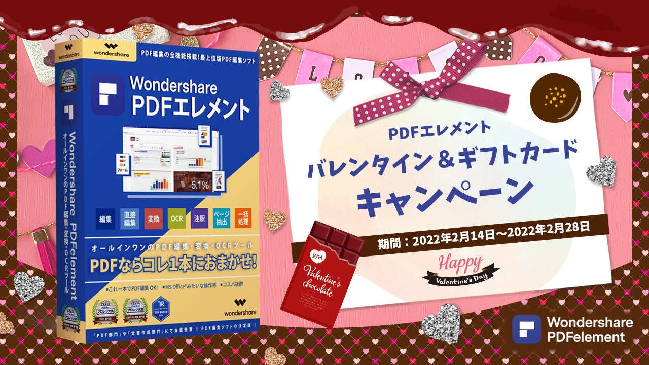 2月の大きなイベントと言えばバレンタイン。コロナ禍の今チョコをもらったり、あげたりというイベントも少し様変わりした2022年になったのではないでしょうか。PDFelement (PDFエレメント)ではバレンタインにあわせて2月いっぱい開催する「バレンタイン&ギフトカードキャンペーン」を開催させて頂きます。