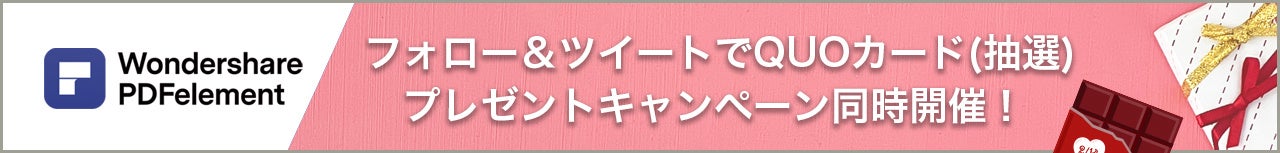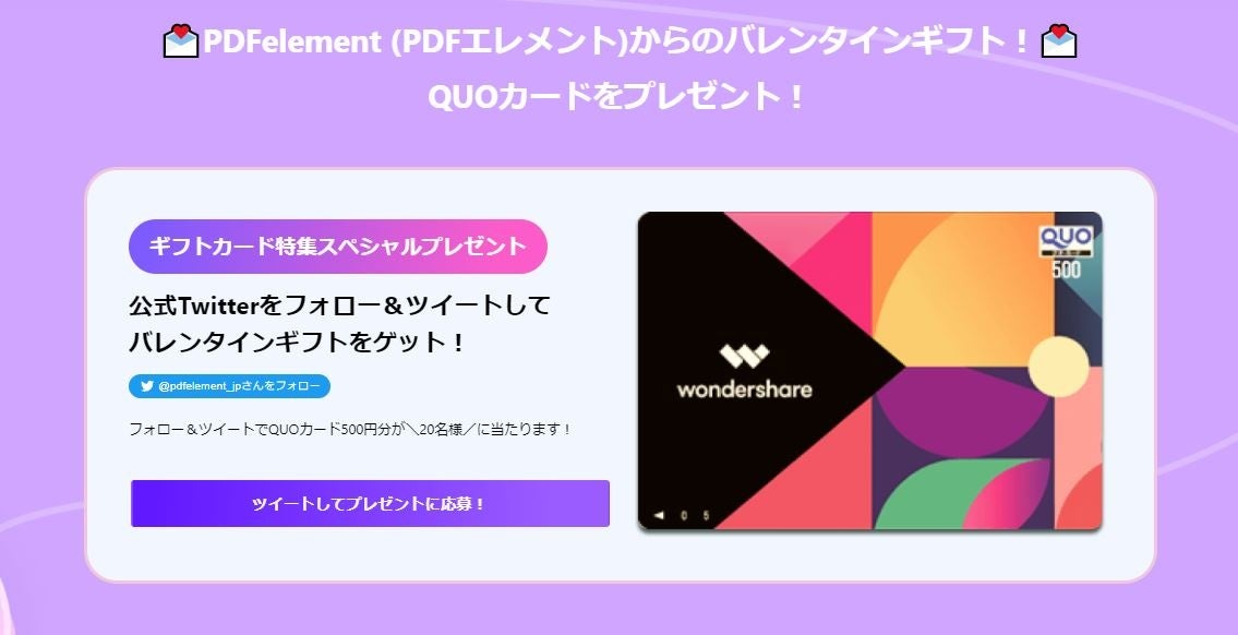 今回のキャンペーンページではPDF編集ソフトのPDFelement (PDFエレメント)からバレンタインギフトその2として、QUOカード500円分もご用意致しております。フォロー&ツイートして頂けた方の中から抽選で20名様にプレゼントさせて頂きます。簡単にご参加頂けるプレゼントなので是非ご参加頂けると嬉しいです。
