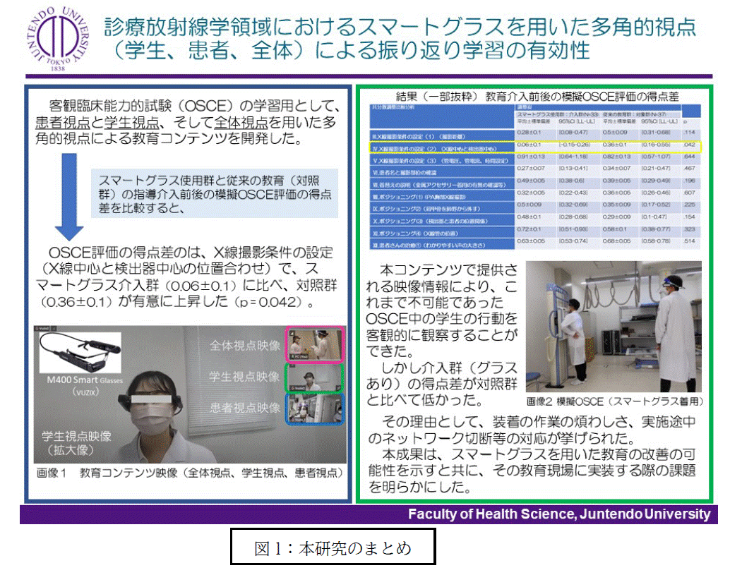 研究デザインは、従来の教育方式(対照群)とスマートグラスを用いた教育コンテンツでの教育方式(介入群)におけるランダム化比較試験としました。調査対象は、順天堂大学保健医療学部診療放射線学科3年の学生でOSCE受験予定者117人中のアンケート調査に同意が得られた70人(対照群37人、介入群33人)でした。今回の調査では、胸部X線撮影をOSCEの試験項目としました。模擬OSCEは教育介入の前後に実施しました。評価者は診療放射線技師免許を持ち、臨床経験が5年以上の教員5名が担当しました。評価項目は服装、容姿、撮影条件設定(3項目)、患者氏名および部位確認、更衣の説明、ポジショニング(4項目)、患者接遇(5項目)、撮影後対応、手指衛生実施の全18項目としました。患者視点と学生視点情報をスマートグラス(SMART GLASSES M400,VUZIX)で映像化し、全体視点情報をビデオカメラ(AG-UCK 20G,Panasonic)で映像化して、多視点遠隔作業視線システム(Remote NAKAMA,AVR Japan)で3つの映像をひとつのモニタ上で同期して観察できる多角的視点による教育コンテンツを開発しました。本コンテンツにより、これまで不可能であったOSCE時の患者の視点、学生の視点、学生の行動を客観的に観察することができ、スマートグラス介入群で模擬OSCEでの高得点化につながると予想していましたが、X線撮影条件の設定の一部で、スマートグラス介入群(0.06±0.1)に比べ、対照群(0.36±0.1)が有意に上昇しました(p = 0.042)。その他の項目では、有意な差はみられませんでした。
