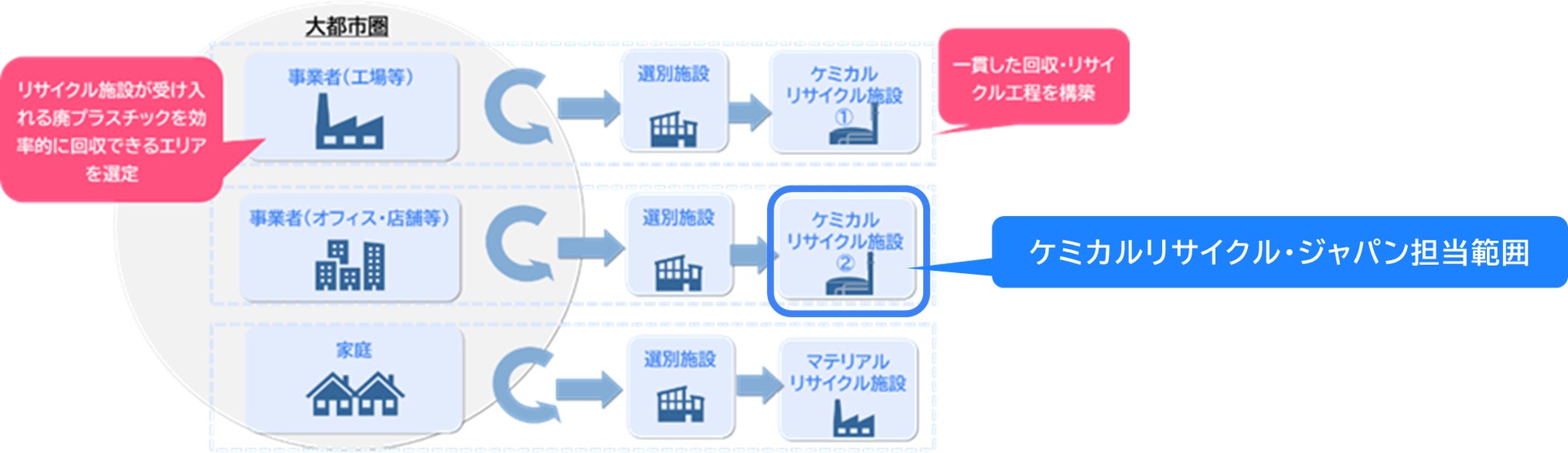 ・実証内容:オフィスや商業施設などから出るオレフィン樹脂やPS樹脂、PET樹脂などを対象に、ケミカルリサイクルを実証。首都圏全体での循環型サプライチェーンのモデル構築。
