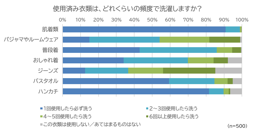 ・肌着、バスタオル、ハンカチなど、肌に触れるものや濡れやすいものは、「1回使用したら必ず洗う」が多いが、ジーンズは「6回以上使用したら洗う」が3割近く