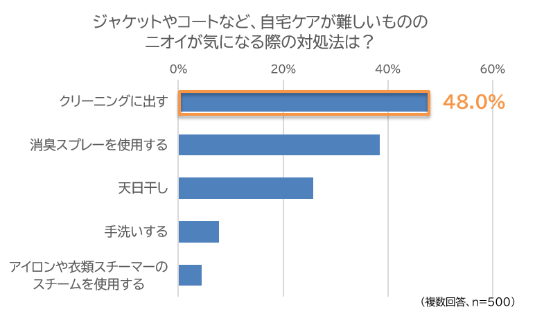 ジャケットやコートなど、汗をかいたり、ニオイがついたりしても自宅のケアが難しいアイテムの対処法は、「クリーニングに出す」が48.0%に。脱臭機能がついたアイロンや衣類スチーマーもありますが、他の対策法と比較するとまだ使用頻度が低いことが分かりました。