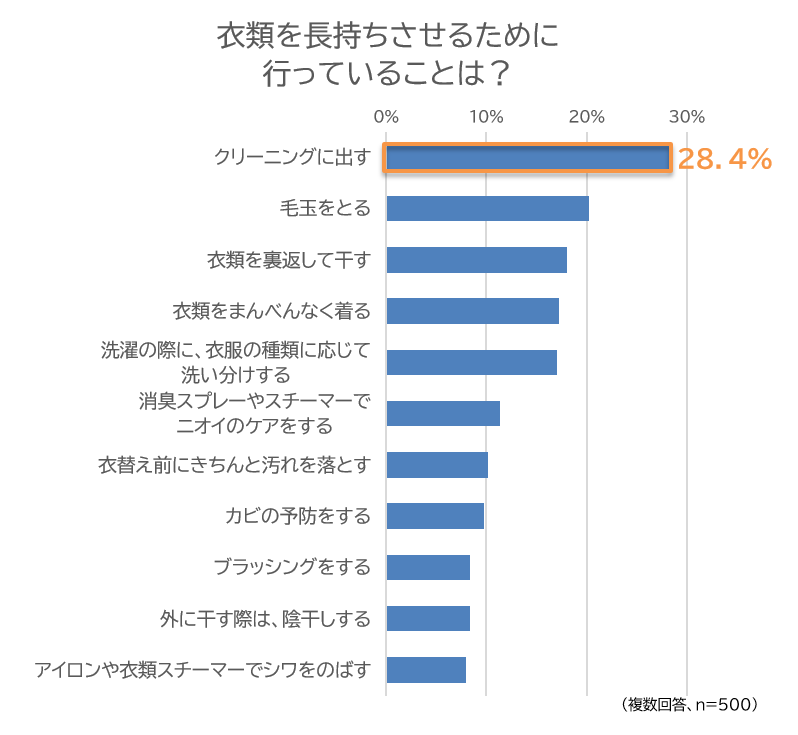 最後に、大切な衣類を少しでも長く着るために行っていることを聞きました。「クリーニングに出す」が28.4%で一番多く、続いて「毛玉をとる」「衣類を裏返して干す」など日頃から衣類ケアを行っていることがわかりました。