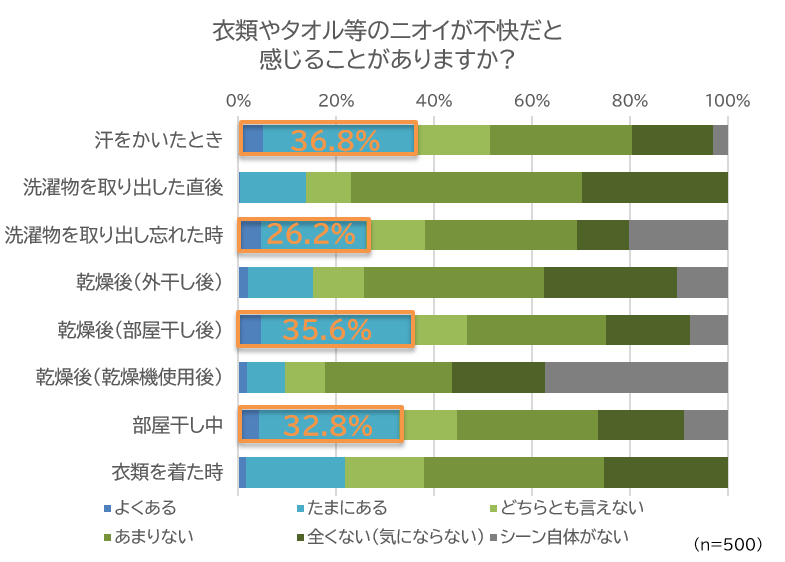 まず、どのようなシーンで衣類やタオルのニオイが不快と感じるか聞いてみたところ、大きく3つのシーン(①汗をかいた時、②部屋干し時、③洗濯物を取り出し忘れた時)があることがわかりました。