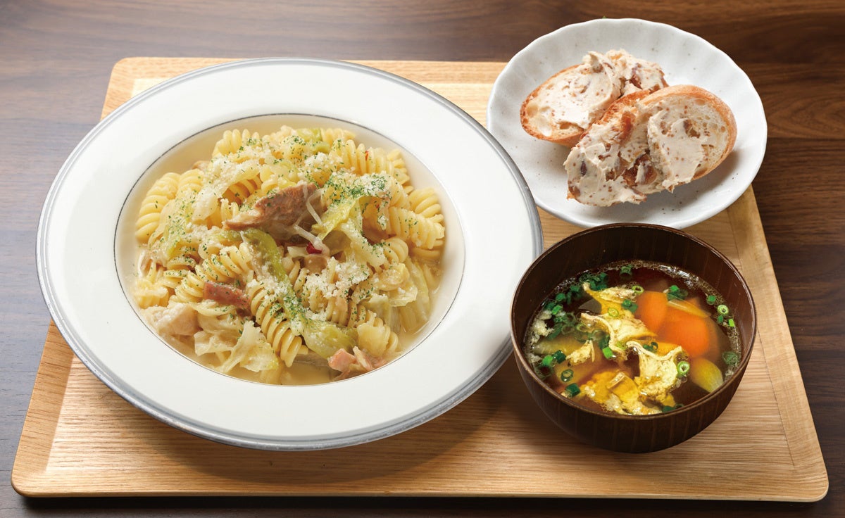 「あぶらかす」の旨みが春キャベツの甘さを存分に引き出した、春らしくやさしい味わいのクリームパスタ。重くなりがちなクリーム仕立てでも軽やかに仕上げ、ショートパスタのフジッリでソースの旨みをしっかり絡めました。