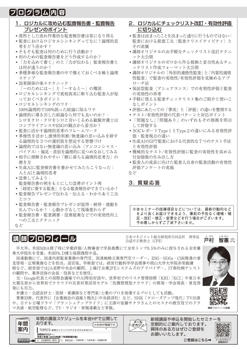 ・演題: 「監査ロジカルシンキング講座: 戦略的な監査報告書作成・チェックリスト改訂・有効性評価のポイント」