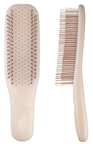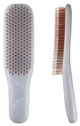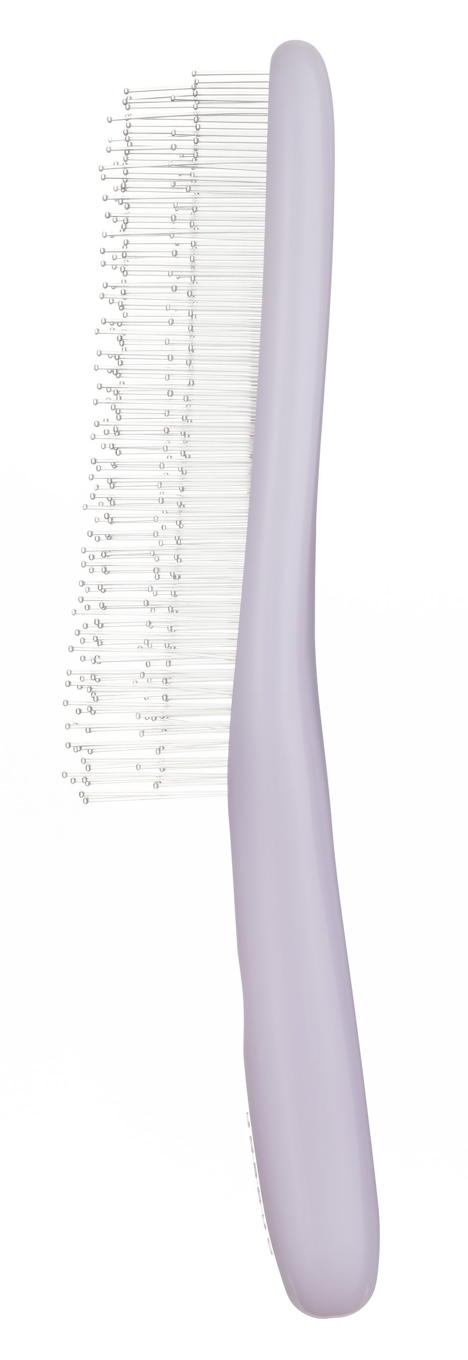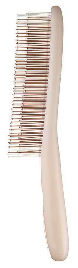 適度な厚みのあるコンパクトなハンドルが、手にフィット。従来のヘアスムースブラシ(ハード/ソフト)よりもピンが長く、柔らかい素材で、頭のカーブにフィットしやすいように真ん中5列のピンの長さが短くなっています。