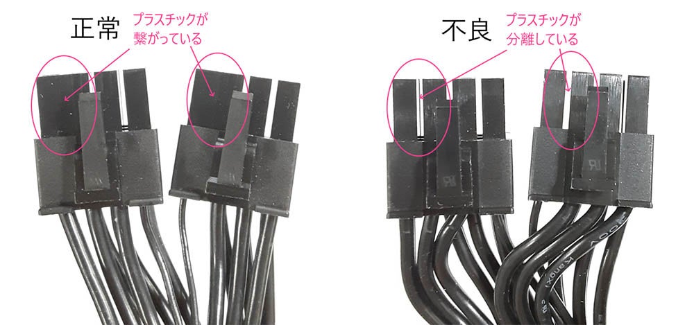 プラグインケーブルの電源ユニット側へ接続するコネクタ形状が誤っており、電源ユニットのPCIEソケットに挿すことができません。