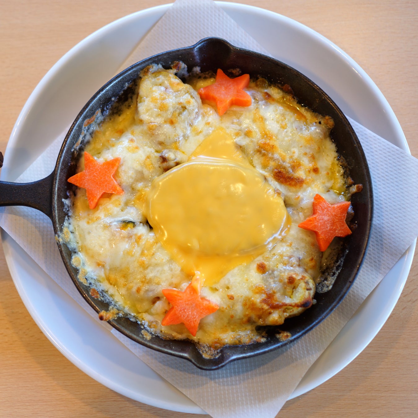 甘味の広がるキーマカレーにチーズをたくさんのせて黄金色に焼き上げた、王国特製カレー。