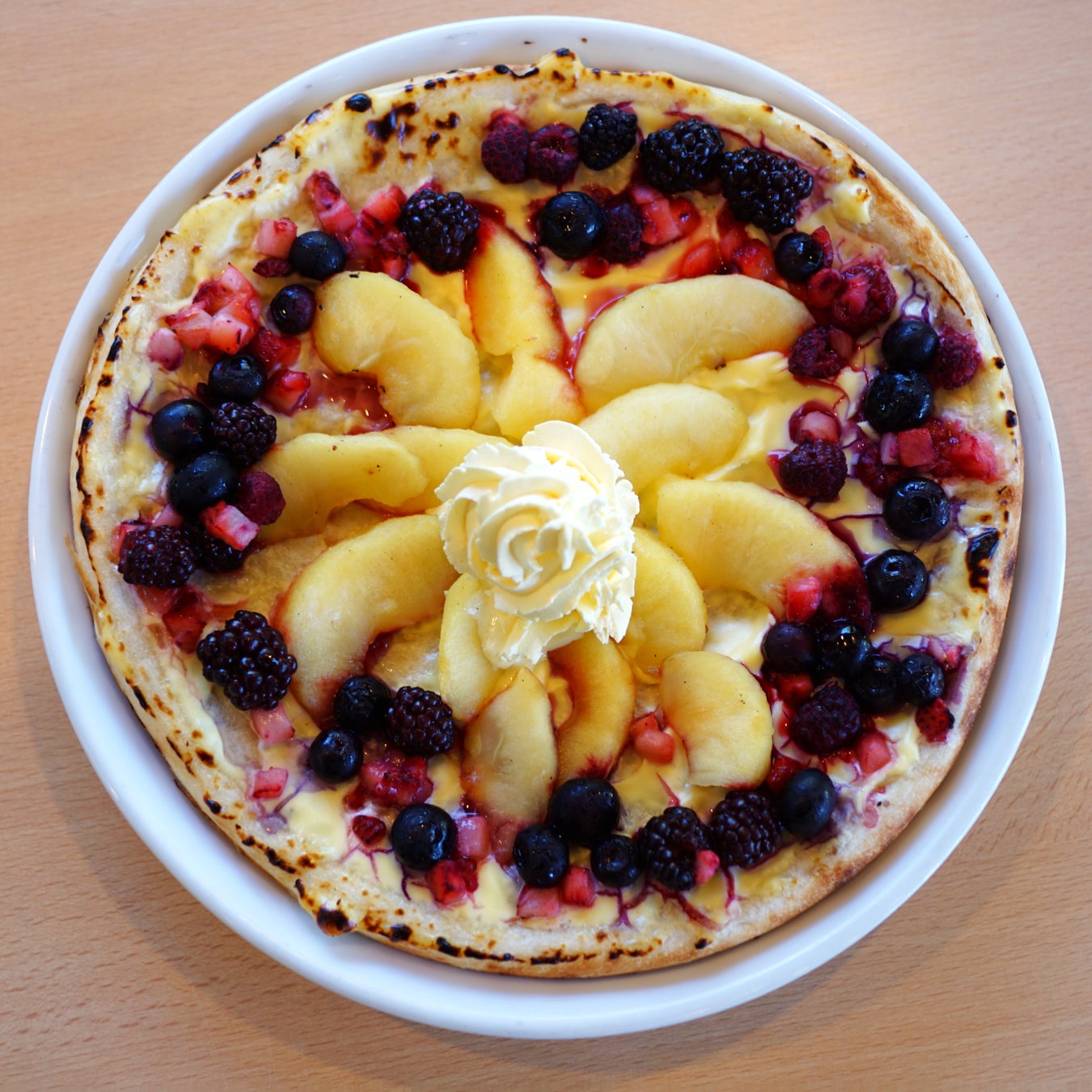 カスタードベースの記事に、禁断の果実(りんご)とベリーフルーツ各種を盛り込み盛り込み焼き上げた、”もりのまじょ”特製ピザ。