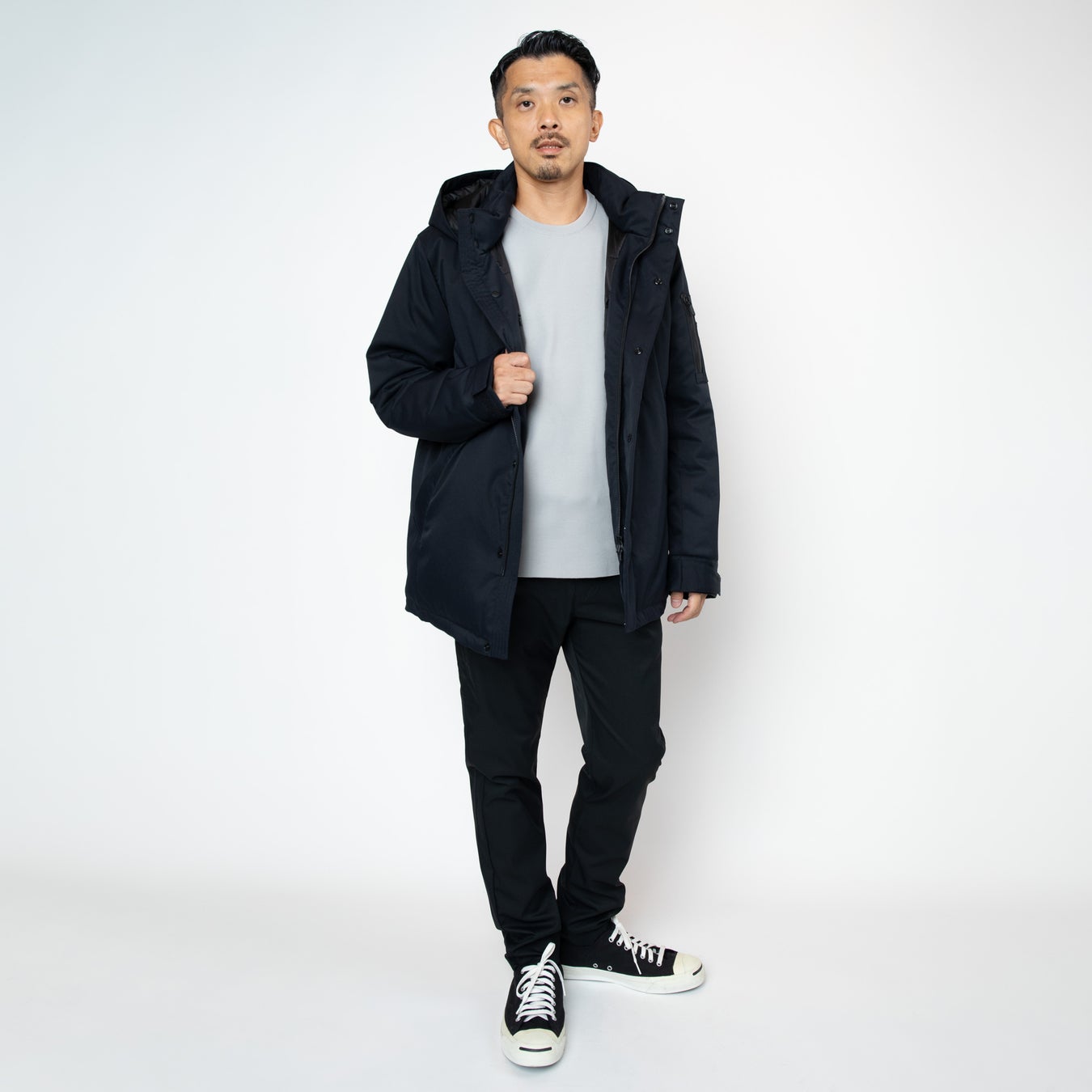特徴:秋から春まで着用できるショート丈のアウター。スナップボタンで取り外し可能なライナーは、インナーダウンとして着用でき、気温やスタイルに応じて着方を変えられます。フードは着脱可能。