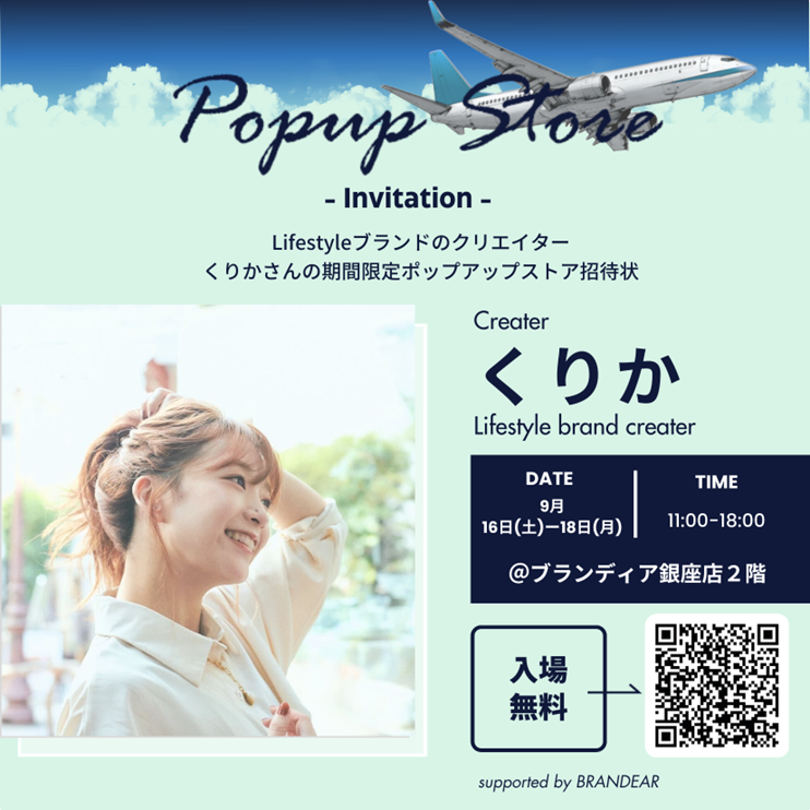 「ブランドを立ち上げて1年半、ひとつの夢だったPOPUP SHOPをさせていただくことになりました。たくさんの方に喜んでいただける空間を作りたいと思っております!9月の3連休、ぜひ遊びに来てください♡」