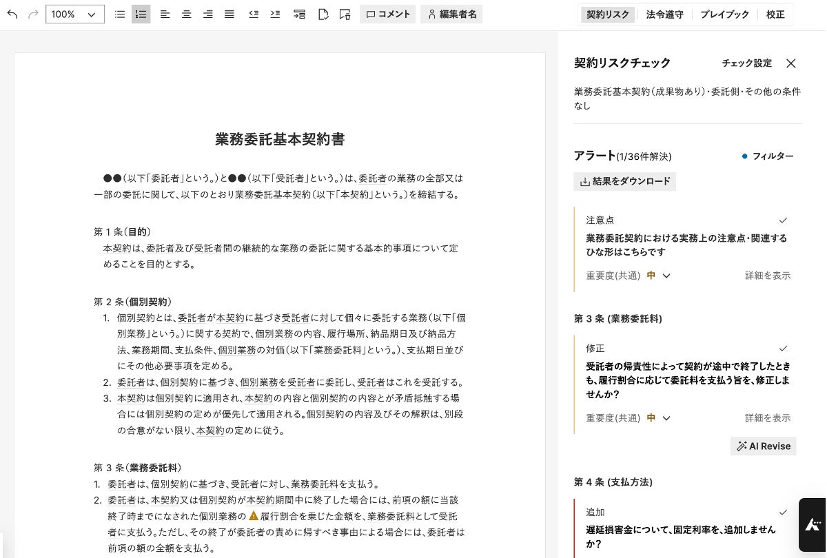 株式会社LegalOn Technologies(本社:東京都渋谷区 代表取締役 執行役員・CEO:角田望、以下LegalOn Technologies)が提供する、AI法務プラットフォーム「LegalOn Cloud」( https://www.legalon-cloud.com/)にて、大規模言語モデルを活用した契約書の修正文案表示機能、「AI Revise」を提供開始しました。「AI Revise」は、LegalOn Technologiesグループのグローバル向けAI契約レビューサービス「LegalOn Global」の主力機能であり、今回本機能を国内向けサービスの「LegalOn Cloud」に転用し、提供を開始します。これにより、契約書の修正をより短時間で効率的に行うことが可能になりました。