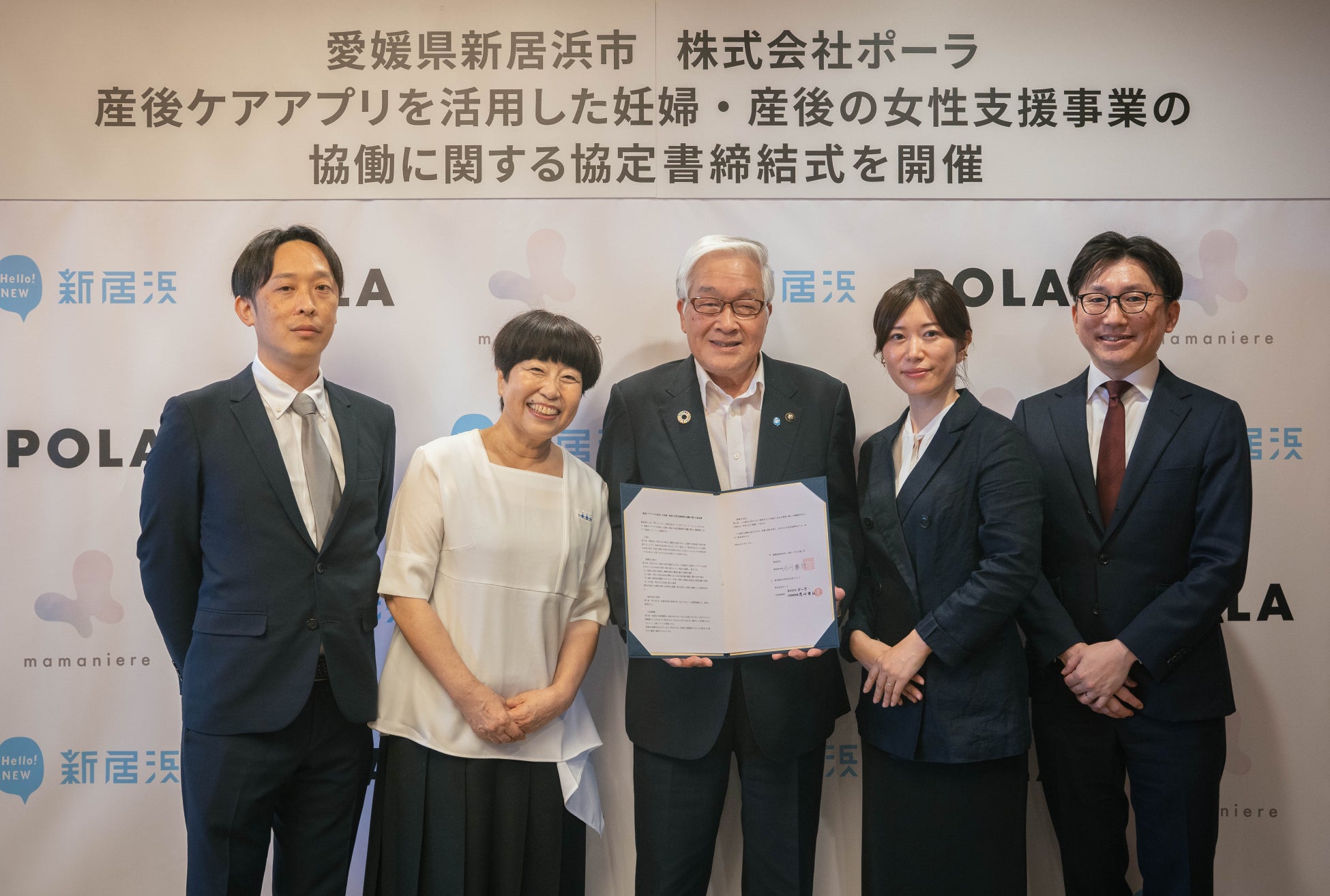株式会社ポーラ(本社:東京都品川区、社長:及川美紀)は、この度、愛媛県新居浜市(市長:石川勝行)と、産後ケアアプリ「mamaniere(ママニエール)」を活用した妊婦・産後の女性支援事業の協働を目的に、連携協定を締結しました。