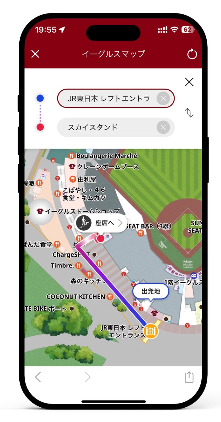 『イーグルスマップ』は、行きたい売店や座席の場所への経路を簡単に調べることができ、これまで以上に楽天モバイルパーク宮城での観戦を快適にお楽しみいただける機能です。