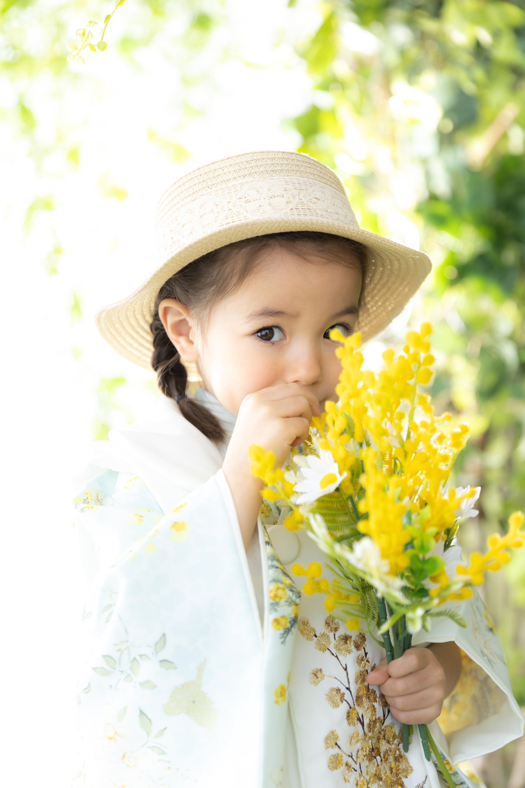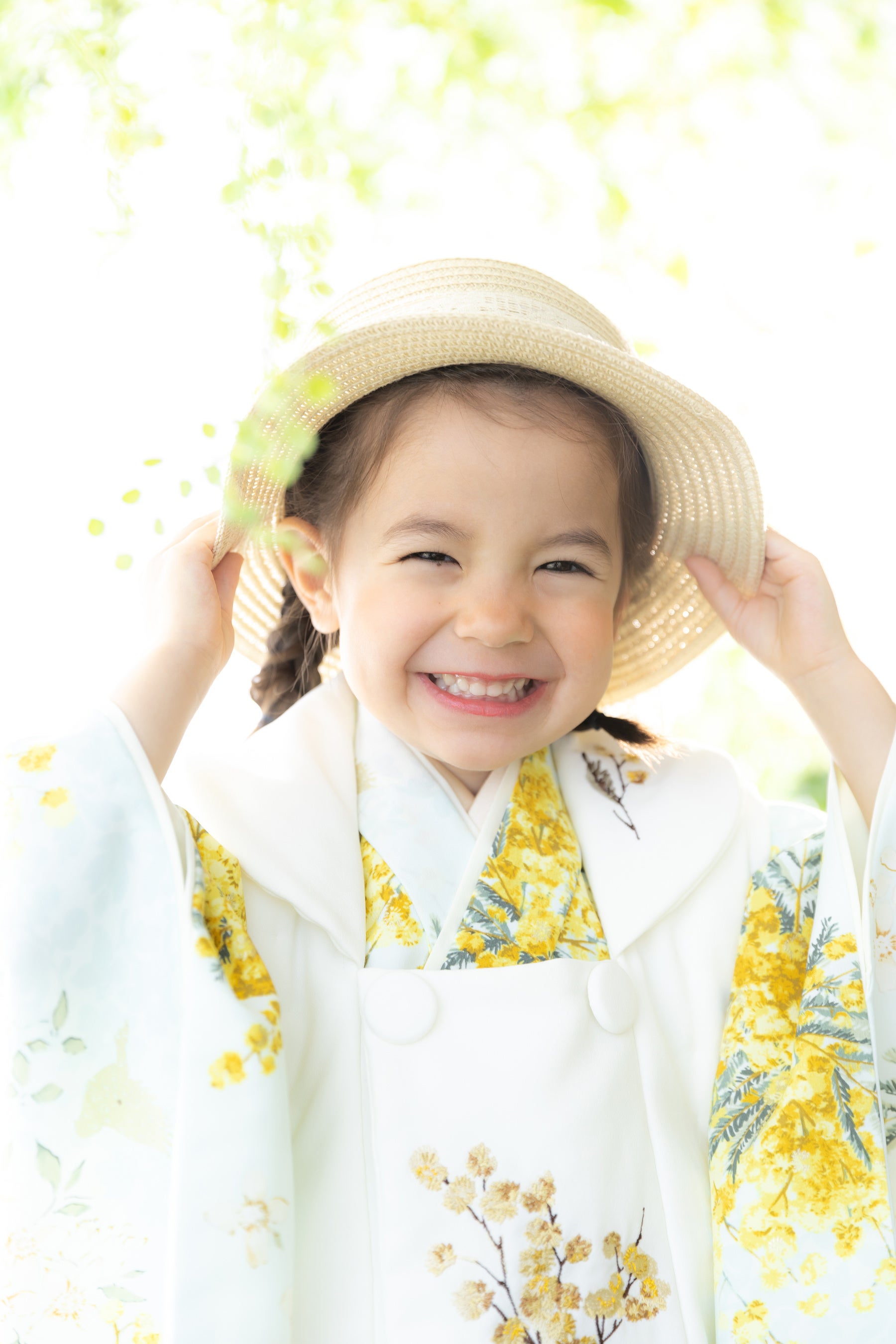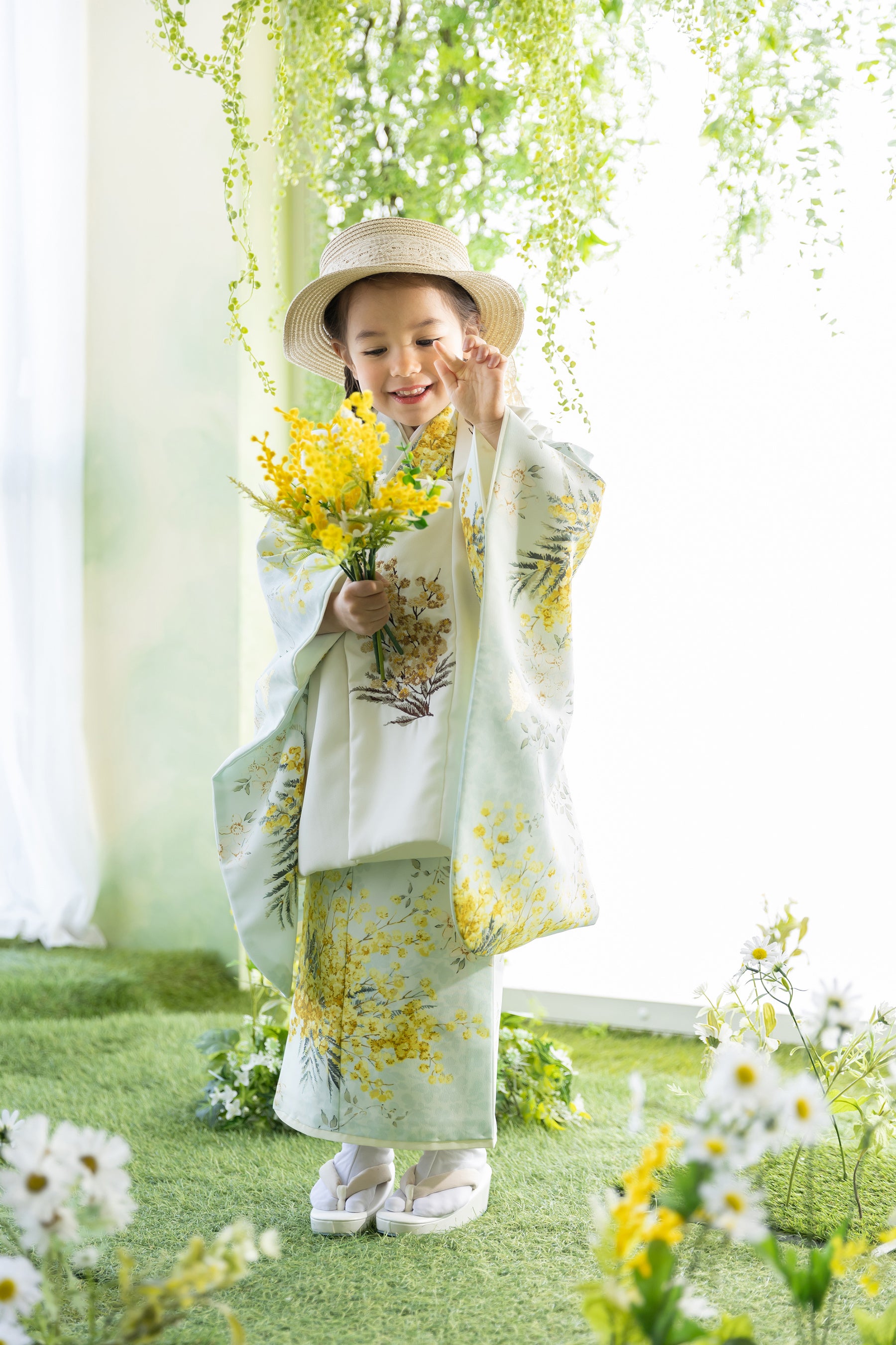 PalettePlus札幌西店に入荷した3歳女の子さんの今シーズンの新作着物は、流行のペールカラーを取り入れた可愛らしいミモザの柄。