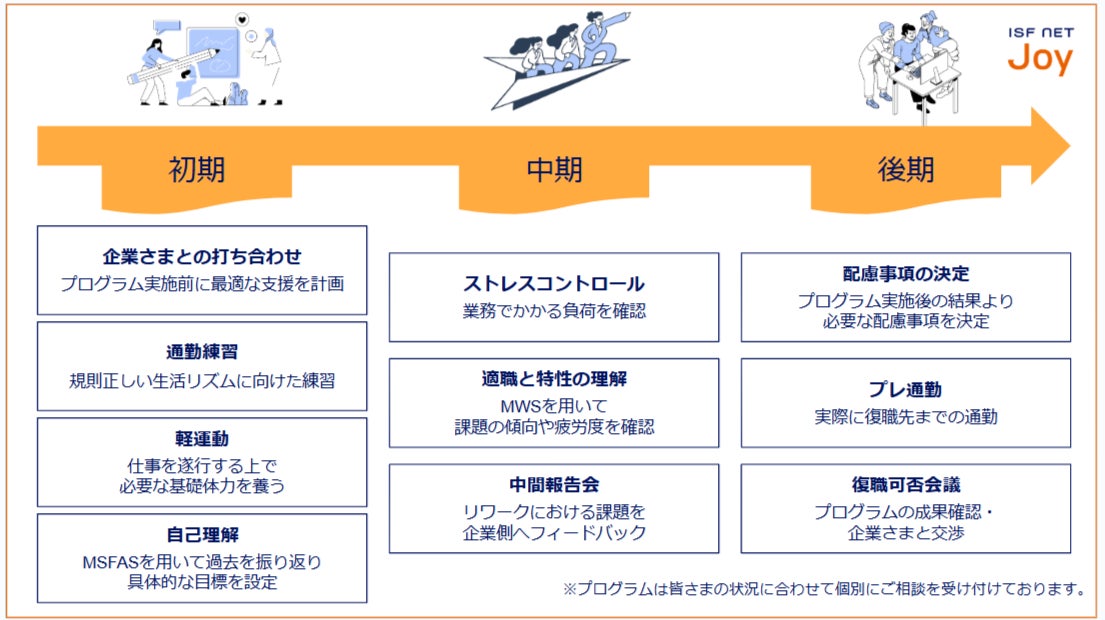 株式会社アイエスエフネットジョイ(本社:東京都新宿区、代表取締役:渡邉幸義、以下、アイエスエフネットジョイ)は2025年6月より、うつ病や双極性障害、神経症圏など精神障がいを理由に休職された方々を対象に、円滑な職場復帰や再発防止を目標とする『リワークプログラム』の提供を沼津事業所(静岡県沼津市)にて開始いたします。