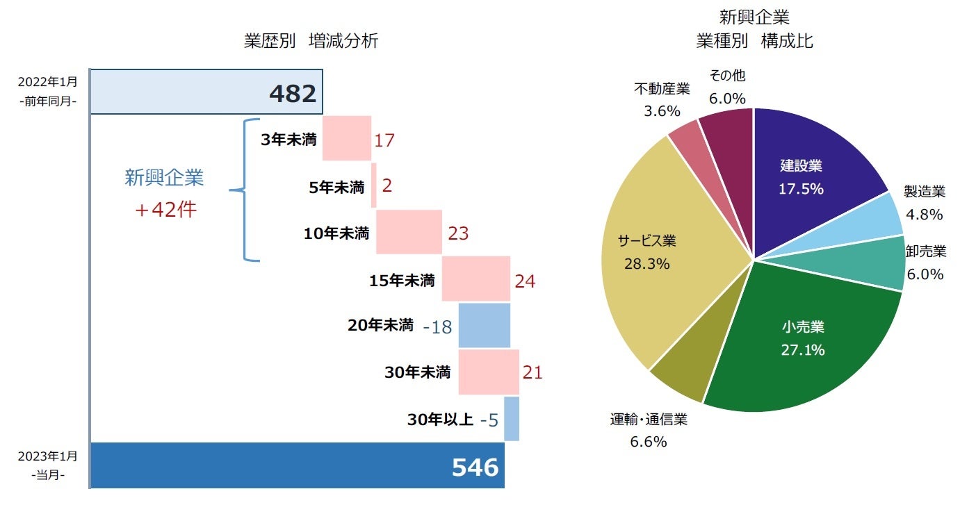 また、「3年未満」(前年同月19件→36件、89.5%増)、「5年未満」(同37件→39件、5.4%増)、「10年未満」(同68件→91件、33.8%増)など業歴10年未満の新興企業(同124件→166件、33.9%増)は、2009年4月以来13年9カ月ぶりに6カ月連続の前年同月比2ケタ増となった。新興企業を業種別にみると、小売業(同24件→45件、87.5%増)が最多、このうち飲食料品小売(同1件→11件)や飲食店(同12件→20件)で増加が目立った。