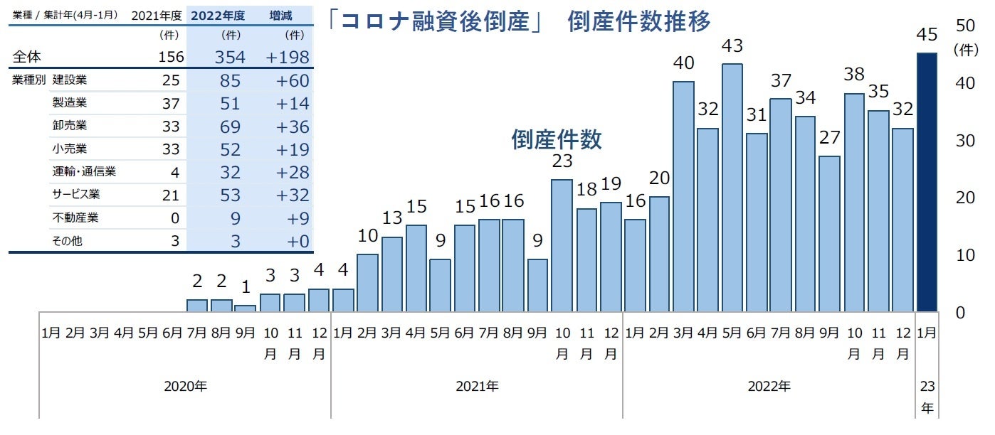コロナ融資後倒産は、2023年1月に月間最多の45件(前年同月16件、181.3%増)発生し、利息も含めた元本返済が本格スタートする3月を目前に大幅な増加となった。また、2022年度累計は354件と、前年度(156件)を大幅に上回っている。「焦げ付き」に相当するコロナ融資損失総額は推計で358億円を超え、国民一人約300円の負担が発生している計算になる。