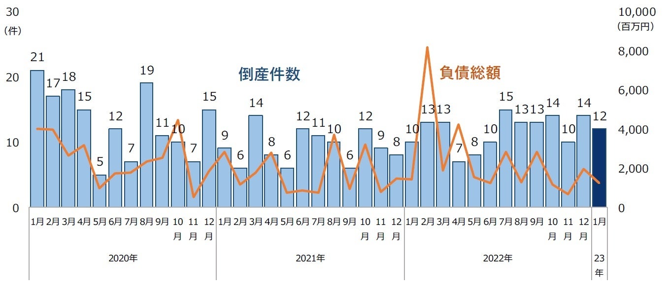 帝国データバンクは、2023年1月の企業倒産件数(負債1000万円以上の法的整理が対象)について集計し、分析を行った。