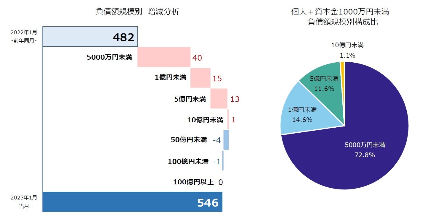 負債規模別にみると、負債「5000万円未満」の倒産は334件(前年同月294件、13.6%増)で、構成比は61.2%を占めた。また、「1億円未満」は84件(同69件、21.7%増)、「5億円未満」では107件(同94件、13.8%増)発生するなど、中小零細規模での増加が目立った。一方、10億円以上の倒産は減少したなか、「100億円以上」は8カ月ぶりに発生しなかった。