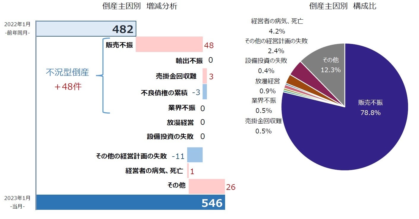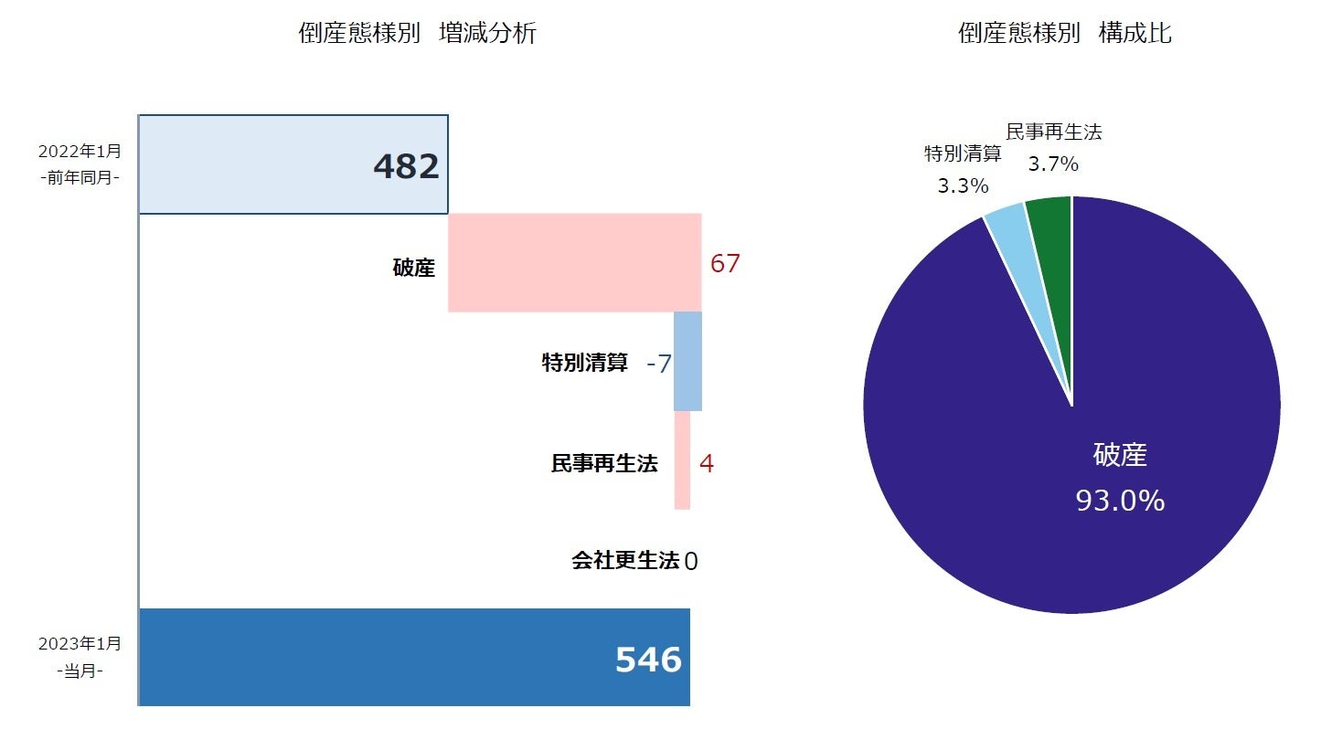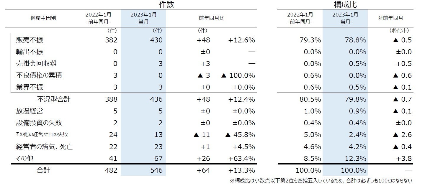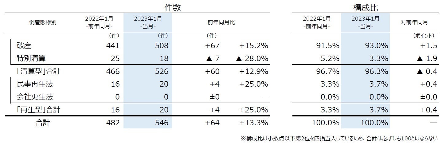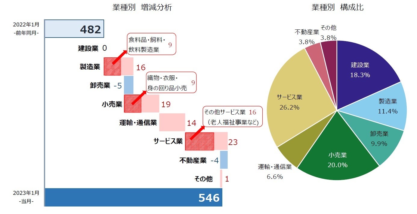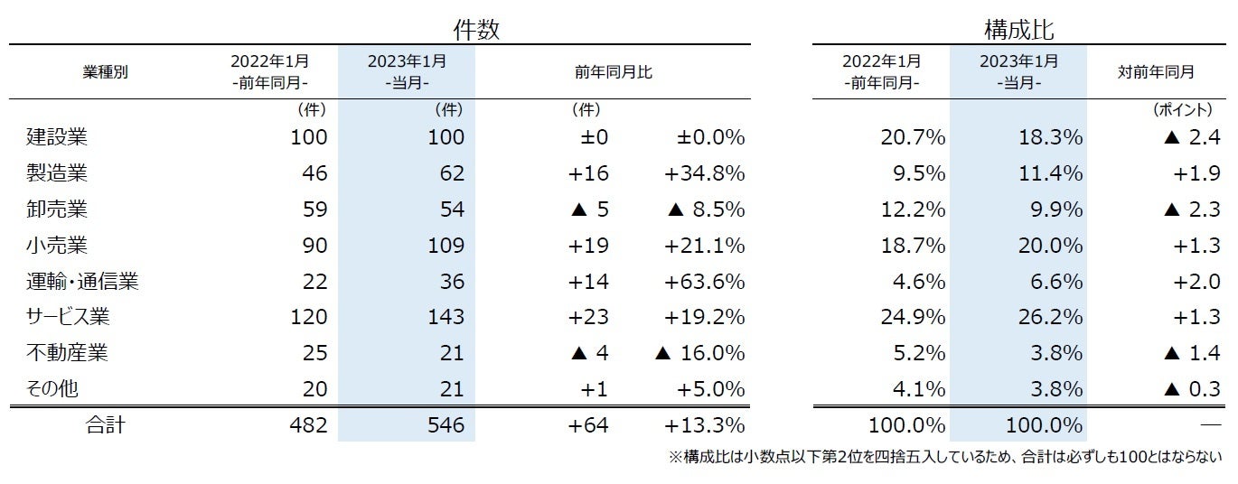 倒産件数は546件(前年同月482件、13.3%増)と、9カ月連続で前年同月比増加。500件台と低水準で推移しているものの、1月としては3年ぶりの前年同月比増加となった