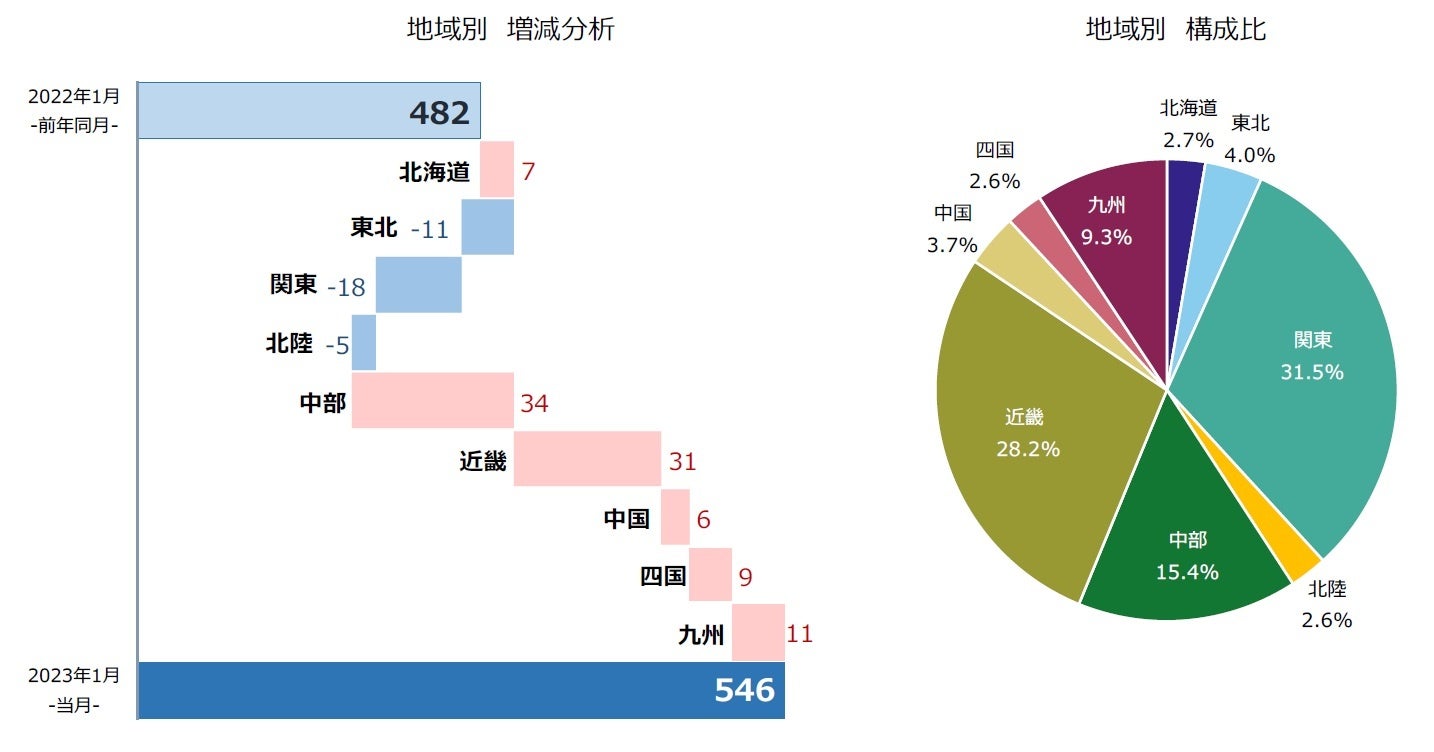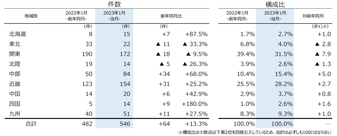 - 地域別にみると、9地域中6地域で前年同月比増加。近畿(前年同月123件→154件、25.2%増)や中部(同50件→84件、68.0%増)を中心に増加目立つ