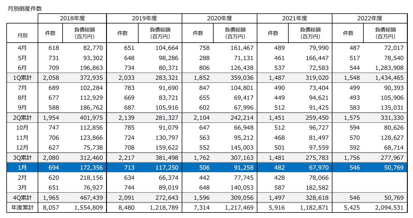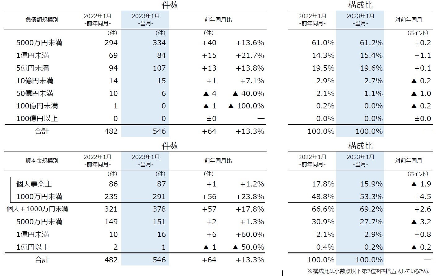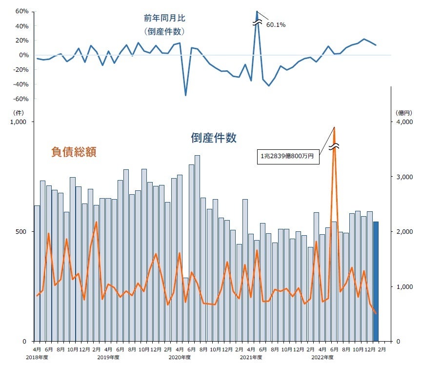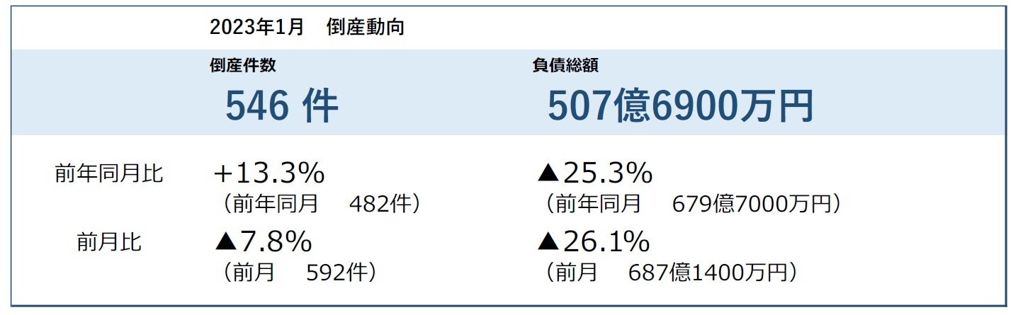 2023年1月の企業倒産は546件発生した。前年に続いて低水準でのスタートとなったものの、9カ月連続で前年同月を上回った。増加期間はリーマン・ショック後の08年6月-09年8月(15カ月間)以来約14年ぶりの増加局面が続いている。負債総額は507億6900万円となり、前年同月から25.3%の大幅減となるなど、企業倒産は一層の小規模化が進んだ。