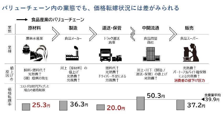 値上げした食品の99%は、原材料高騰など外的なコストアップが要因だ。こうした局面では、原料調達から製造、中間流通、販売を含めた食品産業のバリューチェーン(VC)全体で価格転嫁が欠かせない。ただ、現状では最終消費者の抵抗感が強く、コストアップと価格転嫁の間で板挟みとなっている。昨年12月時点で、100円のコストアップに対し販売価格へいくら転嫁できたか調査した結果、食品産業のVCで最も転嫁が進んでいたのは飲食料品卸売で50円だった。他方、食品スーパーなど川下の食料品小売では37円と低く、食品製造では36円、飼料や燃料などのコストが急増している野菜、畜産など川上の農林水産では25円、物流を担う運輸・倉庫は全産業でワースト3位の20円にとどまる。こうした状況を重く見た政府は、正当な理由がない値上げ交渉の拒否は「買いたたき」や「優越的地位の濫用」に当たるとして、強く是正を迫っている。とはいえ、特に消費者に近接する食品産業では、値上げが消費者の買い控えを招き、却って売上減につながるのではという恐怖感が根強い。「値上げは悪」という意識の緩解が先決だ。