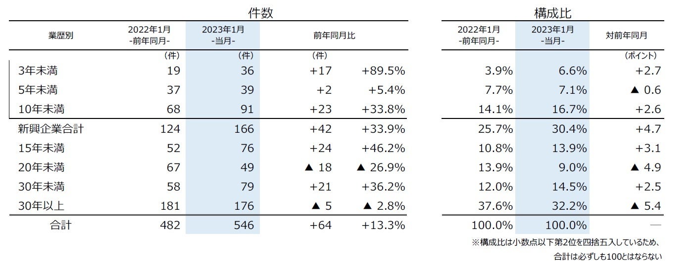 業歴別にみると、業歴「30年以上」が176件(前年同月181件、2.8%減)で最多、構成比は32.2%(対前年同月5.4ポイント減)を占めた。このうち、老舗企業(業歴100年以上)の倒産は4件(前年同月1件)発生した。