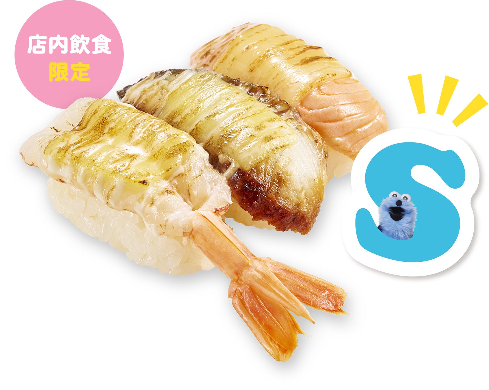 ■商品名:チーズマヨ炙り3貫 パペットスンスンコラボ限定ピック付き(赤えび・うなぎ・サーモン)