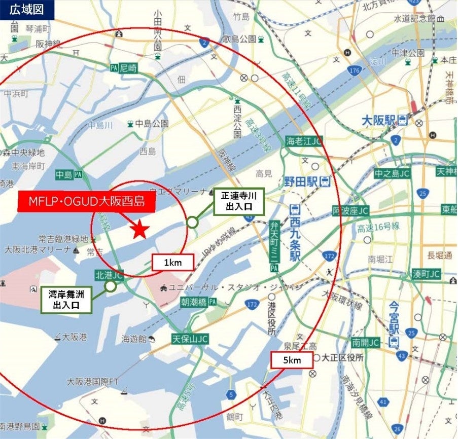 「MFLP・OGUD大阪酉島」は、大阪市此花区酉島に大阪ガス株式会社が所有する土地の一画に位置し、大阪駅まで約7kmと大阪都心部へのアクセスが良好かつ阪神高速5号湾岸線「湾岸舞洲」出入口まで約3.9㎞と、都市部、広域への配送の双方に対応可能な物流適地に立地しております。また、近隣に競合物件が少なく、大阪シティバスの「常吉一丁目」バス停から徒歩6分と従業者の通勤利便性に優れており、人材確保に優位性のある立地です。