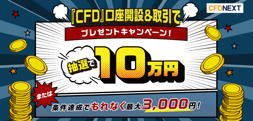 対象期間中にCFD口座開設[※1]&取引条件①~③を全て達成された方の中から、抽選で10名様に「現金100,000円」をプレゼントいたします。外れた方にも、取引条件①~③の達成状況に応じてもれなく最大3,000円をプレゼントいたします。